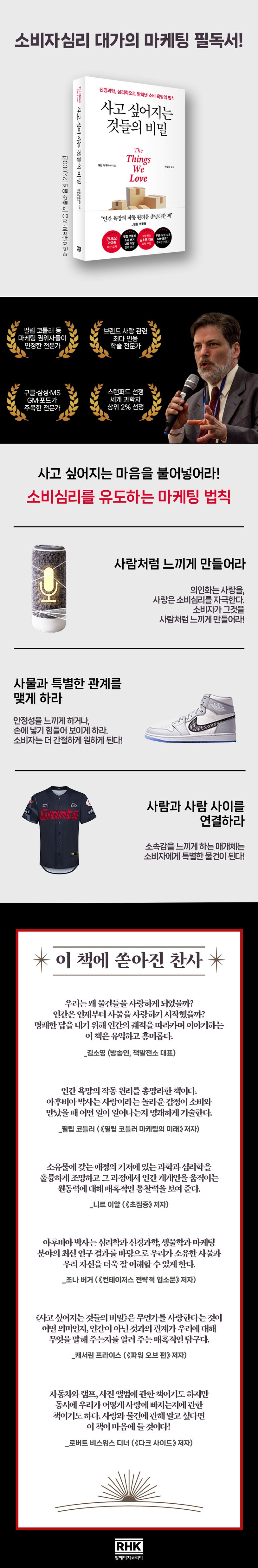 30여 년간 소비자심리학을 연구해 온 애런 아후비아 박사는 소비자들의 양상에서 인간의 생물학적 특성인 ‘사랑’과의 연관성을 발견하였다. 즉 소비자가 사물을 사랑하게 되는 감정적 애착 형성 과정에 그들의 마음을 움직이는 원리가 있을 거라 판단해 신경과학, 마케팅, 심리학 사례를 통해 ‘관계 난로’라는 메커니즘을 발견했다. 관계를 더 깊고 뜨겁게 묶어 주는 이 기법은 의인화, 사람 연결기, 자기감이라는 특성이 있어 소비자가 어떻게 제품을 사랑하는지 이해하게 되고, 때론 제품을 무기 삼아 소비자의 마음을 무너뜨릴 방법도 찾을 수 있다. 또한 브랜드나 제품을 향한 ‘덕후’들의 열망과 개인의 정체성 사이의 관계를 분석해 인간이 사물을 통해 자신을 만들어 나가는 과정까지 면밀히 살펴볼 수 있다. 생애주기에 따른 취향의 변화나 취향이 발현되는 개인적 배경을 이해해 나가면서 인간 욕망의 작동 원리를 파악할 수 있어 더욱더 실용적이다. 소비자의 마음을 다시 뜨겁게 할 묘책을 찾고 싶은가? CEO, 브랜드 마케터, MD, 기획자 등 누구나 상품을 매력적으로 포장하는 비결을 알고 싶다면 이 책을 권한다.