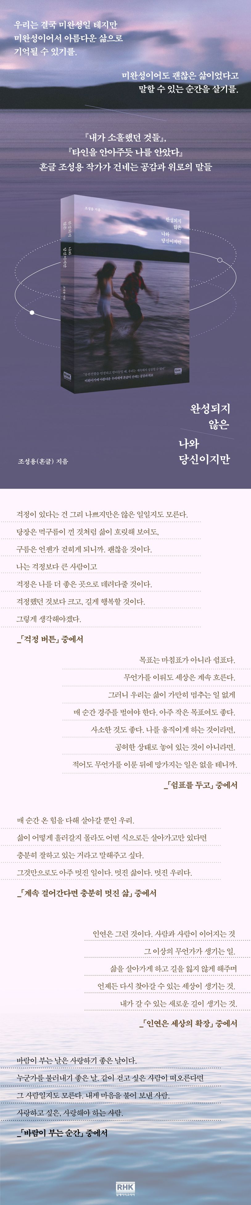 후회 없는 인생이 있을까. 완벽한 인생을 살고 있다고 자부하는 사람이 있을까. 사람은 누구나 완성되지 않은 삶을 살아간다. 수많은 것들을 놓치고 잃어버리고 다시 사랑하며. 삶이라는 늪에 빠져 스스로가 한없이 작고 부족하게 느껴지기도 하고, 타인의 말 한마디에 휘둘려 휘청일 때도 있다. 인생에 관계에 사랑에 실패하고 아파하기도 한다. 그리고 삶에 익숙해질대로 익숙해져 어딘가 체념한 듯한 눈빛을 가진 눅눅한 어른이 되어 간다. 너무 빨리 포기해버린 일, 잡을 수 있었음에도 무심히 흘려보낸 관계, 청춘을 조금 더 빼곡히 쓸걸 후회하면서. 그럴 땐 부족해도 괜찮다고, 나도 당신과 같다고 공감하고 위로해주는 누군가의 단단한 말 한마디가 필요하다. 나를 달래는 것보다 타인을 안아주는 것에 능숙했던 조성용(흔글) 작가가 신작 『완성되지 않은 나와 당신이지만』으로 2년 만에 돌아왔다. 완벽하지 않은 인생을 살고 있더라도 불안해하지 말라고, 적어도 스스로를 믿으라고, 당신의 가능성은 지금 느끼는 불안보다 훨씬 더 크다고 말하며.