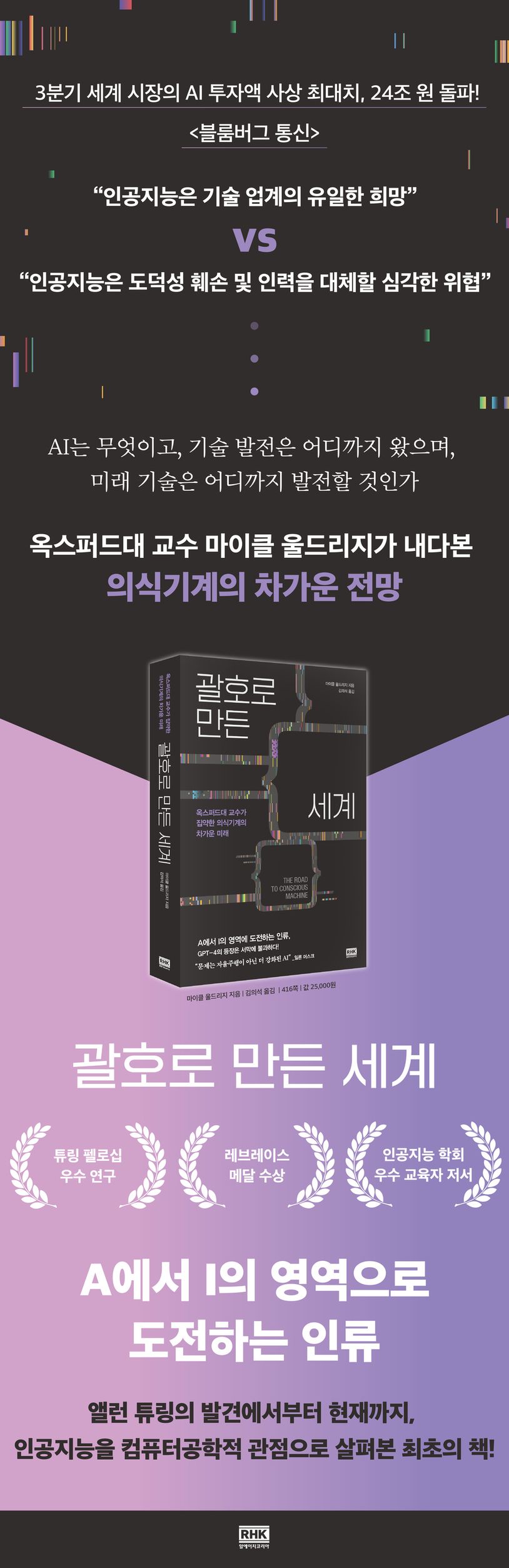 2023년 크리스마스 강연 과학 부문 연사로 영국 왕립연구소 연단에 오르는 인공지능 전문가 마이클 울드리지는 컴퓨팅 기술 특히 인공지능이 실패해온 기록을 제대로 살펴보기만 해도 인공지능의 존재에 대한 의문을 씻어낼 수 있으리라 믿었다. 이렇게 탄생한 이 책 『괄호로 만든 세계』에서 의식기계(conscious machine)를 완성하기 위해 인류가 도전해 온 궤적을 따라 컴퓨터 관련 업계 및 사회 전반에 어떠한 이해충돌이 발생했으며, 이렇게 등장한 시스템의 탄생 배경과 그 기술적 한계를 객관적으로 소개한다. 컴퓨팅 기술에 대한 배경지식이 없는 독자들도 인공지능의 역사를 공학자의 관점을 따라 톺아보면서 과연 인공지능이 무엇인지 그 본질과 의의에 한층 더 가까이 다가갈 수 있다.