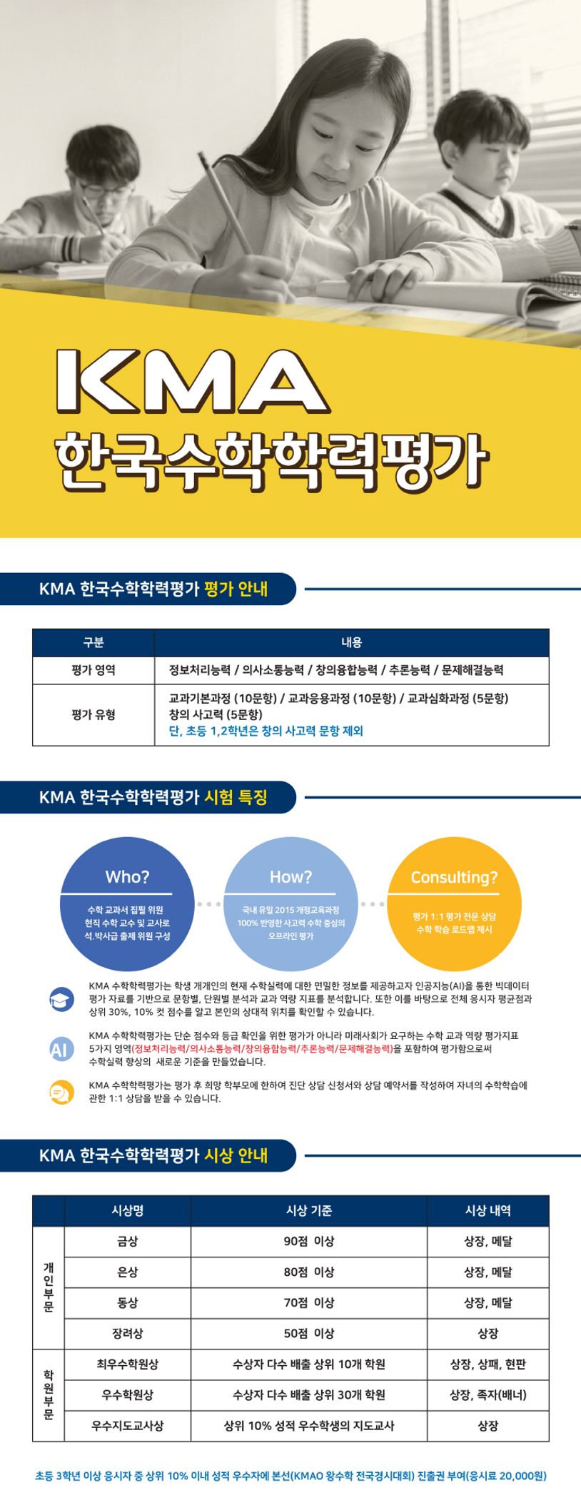 - 초등 수학 각 학년별 1 학기 1~5 단원 (초등 1학년은 1~4 단원) 범위를 기준으로 KMA 한국수학학력평가를 대비