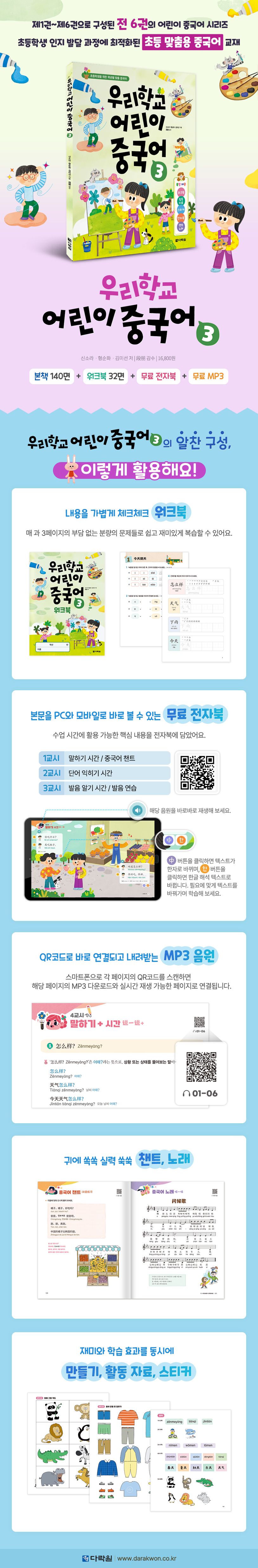 『우리학교 어린이 중국어』 시리즈는 초등학생의 인지 발달 과정을 중시하여, 그에 맞는 학습법과 학습량으로 보다 쉽게 중국과 중국어에 대한 종합적인 정보를 학습하는 것을 목표로 설계한 교재입니다. 『우리학교 어린이 중국어 3』에서는 주인공 지우가 엄마와 함께 베이징으로 공부하러 떠나 새 친구들을 사귀며 즐거운 중국 생활을 시작합니다. 주인공 친구들과 함께 즐겁게 일상 회화를 배우고, 챈트와 노래를 따라 부르며 중국어를 재미있게 배울 수 있습니다. 또 병음 읽기 훈련을 하고 단어를 따라 써 보며 3권에서도 꾸준히 중국어 발음을 연습해 보세요.