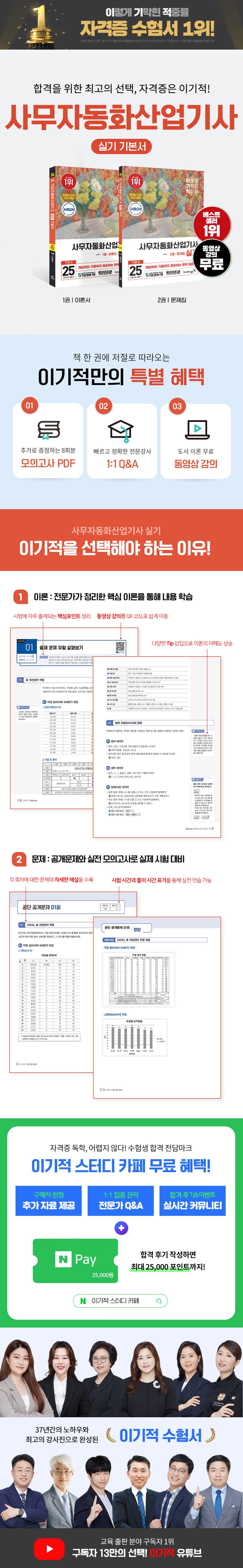 ‘2025 이기적 사무자동화산업기사 실기 기본서’ 도서가 출간되었습니다. 시험에 나오는 핵심이론 학습부터 공단 공개문제 풀이까지 단기완성으로 끝낼 수 있도록 구성하였습니다. 1권에는 실기 시험의 작업 과정을 자세히 수록하여, 순서대로 따라 하기만 해도 문제 유형과 풀이 방법을 빠르게 익힐 수 있습니다. 실기 시험을 처음 준비하는 수험생도 차근히 따라할 수 있도록 이론 부분의 동영상 강의를 무료로 제공하고 있습니다. 아울러 2권에는 공단에서 공개한 공개문제 6회분과 모의고사 2회분을 상세한 작업 풀이 과정과 함께 수록하여 실전에 확실하게 대비할 수 있습니다. 뿐만 아니라 모의고사를 더 풀어보고 싶은 독자들을 위해 3~10회분의 실전 모의고사 PDF를 추가로 제공합니다.