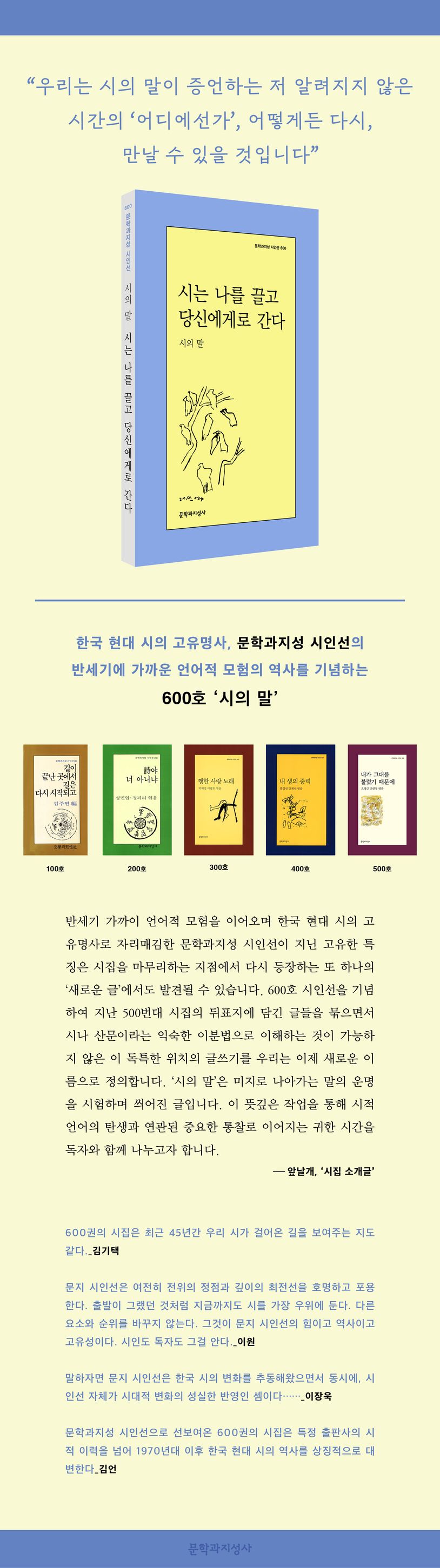 반세기 가까이 언어적 모험을 이어오며 한국 현대 시의 고유명사로 자리매김한 문학과지성 시인선이 지닌 고유한 특징은 시집을 마무리하는 지점에서 다시 등장하는 또 하나의 ‘새로운 글’에서도 발견될 수 있습니다. 600호 시인선을 기념하여 지난 500번대 시집의 뒤표지에 담긴 글들을 묶으면서 시나 산문이라는 익숙한 이분법으로 이해하는 것이 가능하지 않은 이 독특한 위치의 글쓰기를 우리는 이제 새로운 이름으로 정의합니다. ‘시의 말’은 미지로 나아가는 말의 운명을 시험하며 씌어진 글입니다. 이 뜻깊은 작업을 통해 시적 언어의 탄생과 연관된 중요한 통찰로 이어지는 귀한 시간을 독자와 함께 나누고자 합니다.