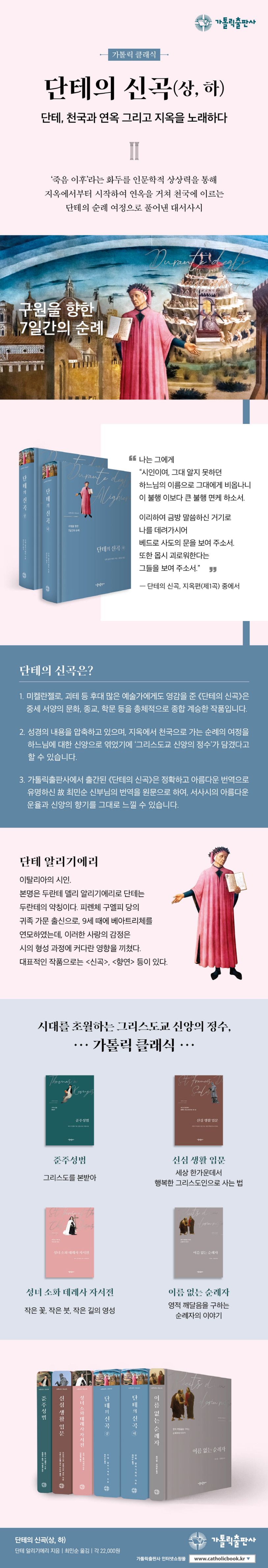당대의 문화, 학문, 종교를 모두 담아낸 중세 문학 사상 가장 위대한 결작, 《단테의 신곡》이 가톨릭 클래식 시리즈로 출간되었다. 그리스도교 신학 및 철학에 대한 지식과 문학적 재능을 바탕으로 원서의 운율을 살리고 풍부한 각주까지 더한 최민순 신부의 번역으로 된 이 책을 세련되고 현대적인 디자인, 고급스러움을 더한 양장 제본, 보기 쉬운 문체로 새롭게 만나보길 바란다.