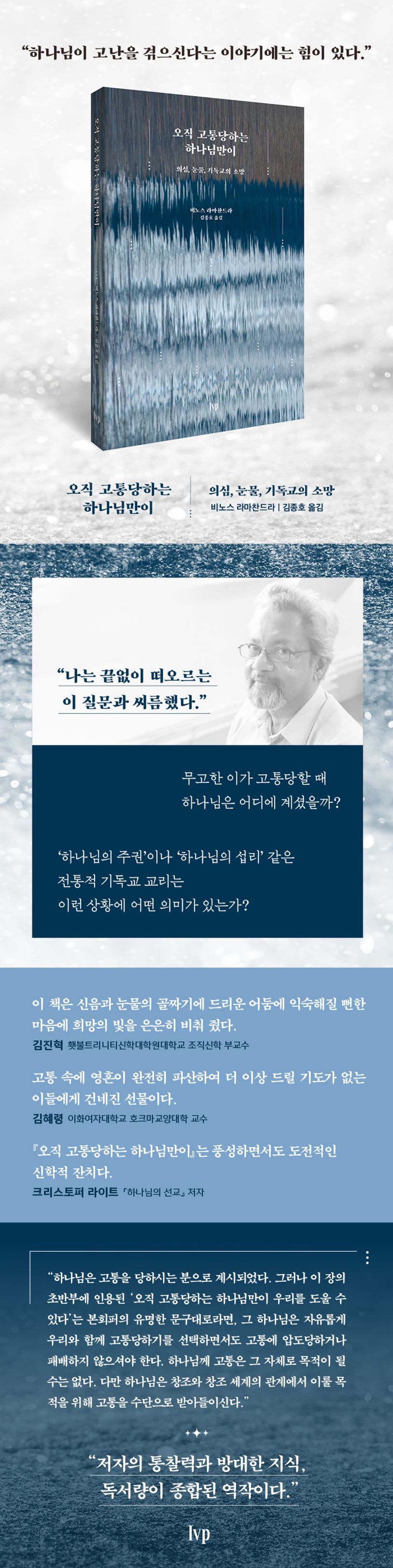 “아시아 최고의 기독교 사상가 중 한 명인” 저자가 심혈을 기울여 쓴 이 책은, 고통에 대한 오해와 왜곡이 난무하는 오늘날 균형 잡힌 교양서가 될 것이다.