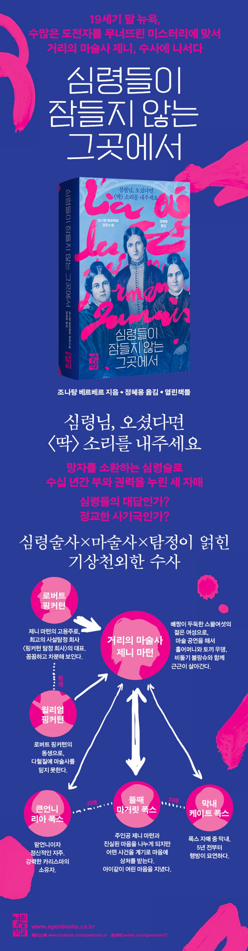 제니가맡은사건의중심에는심령술사폭스자매가있다.큰언니리아,둘째마거릿,막내케이트로이뤄진3인조는망자와소통하는능력을내세워사랑하는사람을잃은이들에게열광적인지지를받으며명성을떨쳐왔다.산사람이혼령과대화한다니분명교묘한속임수가있을텐데,폭스자매가심령주의교단을창시하고금은보화를쓸어모은40여년간비밀은털끝만큼도밝혀지지않았다.이제제니가나설차례.가진것하나없지만진정한마술사가되려는열정만큼은누구에게도뒤지지않는우리의주인공을믿어보자.누구하나알아주는이없어도매일같이갈고닦은마술실력과어떻게든살아남는끈질긴생명력,진실을밝혀내겠다는집념,그리고무엇보다도두둑한배짱이제니의가장큰무기가되어준다.