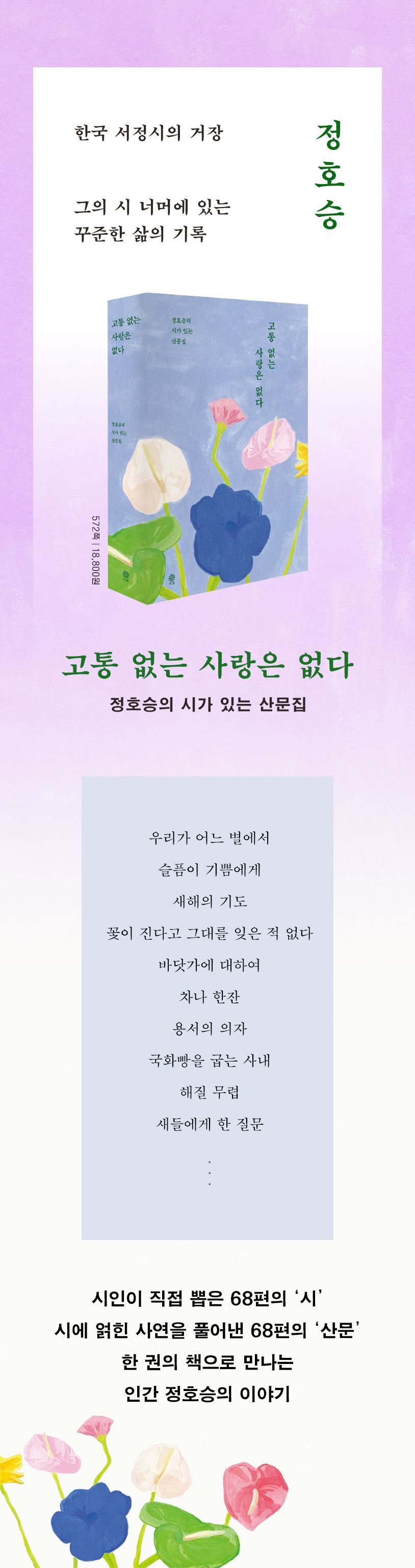 등단 50년을 넘긴 한국 서정시의 거장, 전 세대에 사랑받는 우리 시대 시인 정호승. 그는 어떤 사연이 있어서 그처럼 아름다운 시를 쓸까? 명화의 물감을 걷어내면 거친 스케치가 드러나듯 정호승의 시에도 인간적 삶이 배경으로 깃들어 있다. 《고통 없는 사랑은 없다》는 정호승 시인이 직접 가려 뽑은 시 68편, 그 시에 얽힌 이야기를 풀어낸 산문 68편을 한데 묶은 ‘시가 있는 산문집’이다. 〈우리가 어느 별에서〉 〈슬픔이 기쁨에게〉 〈꽃이 진다고 그대를 잊은 적 없다〉 등 시인의 대표 시가 다수 수록되었으며, 시를 창작할 당시의 사연을 풀어낸 산문들이 짝지어 펼쳐진다. 어린 시절 모습부터 군 복무 시절, 특히 아끼고 사랑하는 사람들, 그리운 부모님의 모습 등 시인이 소중히 간직해온 20여 컷 사진이 함께 실렸다.