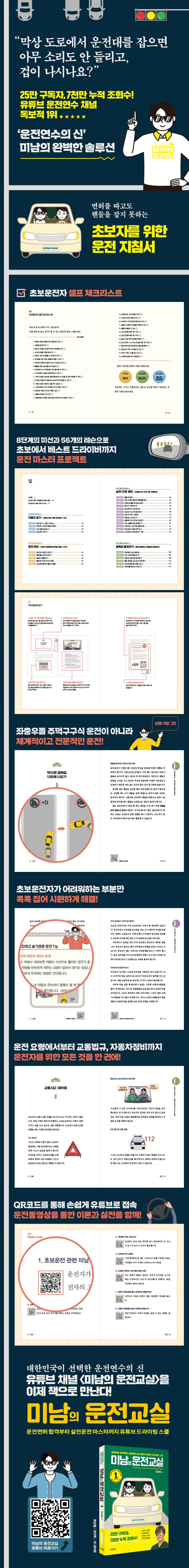 공개되는 운전연수 영상마다 초보운전자들 사이에서 엄청난 화제를 모은 유튜브 〈미남의 운전교실〉을 드디어 책으로 만난다. 운전대만 잡으면 아무 소리도 안 들리고, 정신이 멍하다는 초보운전자들을 베스트 드라이버로 만들어줄 ‘운전연수의 신’ 미남의 도로에서 100% 통하는 운전 노하우가 전격 공개된다. 면허취득을 준비하는 예비 운전자, 운전석이 무서운 초보운전자, 운전법을 잊은 장롱면허 소지자… 미남쌤과 함께라면 누구나 운전고수가 될 수 있다.