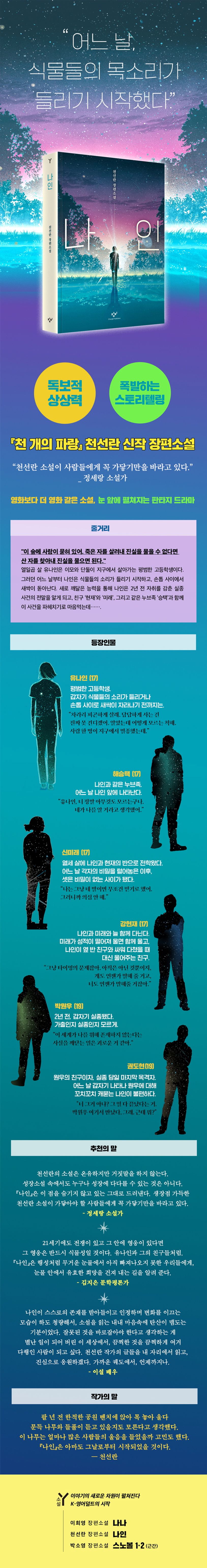 재미와 감동을 전 세대에 전하는 소설Y 시리즈가 새로운 K-영어덜트의 세계를 펼쳐 보인다. 한국형 영어덜트 소설의 지평을 넓히는 이번 시리즈의 두 번째 권으로 제4회 한국과학문학상 대상을 수상한 천선란 작가의 신작 장편소설 『나인』이 출간되었다.
