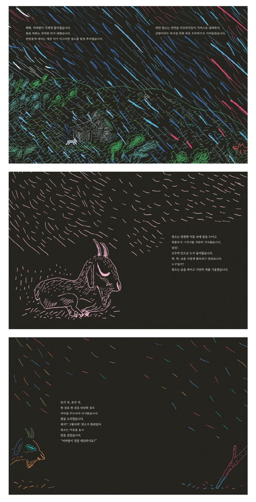 늑대 가부와 염소 메이는 폭풍우 치는 밤에 폭우를 피해 오두막에 숨습니다. 가부와 메이는 서로가 늑대와 염소인 줄 까맣게 모른 채 이야기를 나누다가 친구가 됩니다. 가부와 메이는 헤어지면서 둘만의 비밀 신호를 정하고, 맑은 날 다시 만나기로 약속하는데…….