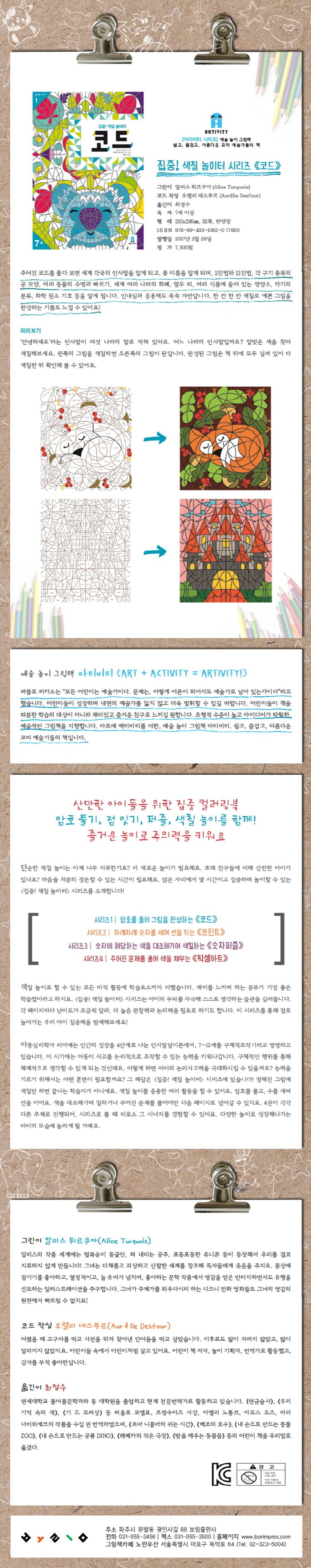 아이의 두뇌를 자극해 스스로 생각하는 습관을 길러주는 집중! 색칠 놀이터 시리즈『코드』. 주어진 코드를 풀다 보면 세계 각국의 인사말을 알게 되고, 꽃 이름을 알게 되며, 2진법와 12진법, 각 구기 종목의 공 모양, 여러 동물의 수명과 빠르기, 세계 여러 나라의 화폐, 열두 띠, 여러 식품에 들어 있는 영양소, 악기의 분류, 화학 원소 기호 등을 알게 됩니다. 또 인내심과 응용력도 쑥쑥 자란답니다. 한 칸 한 칸 색칠로 예쁜 그림을 완성하는 기쁨도 느낄 수 있어요!