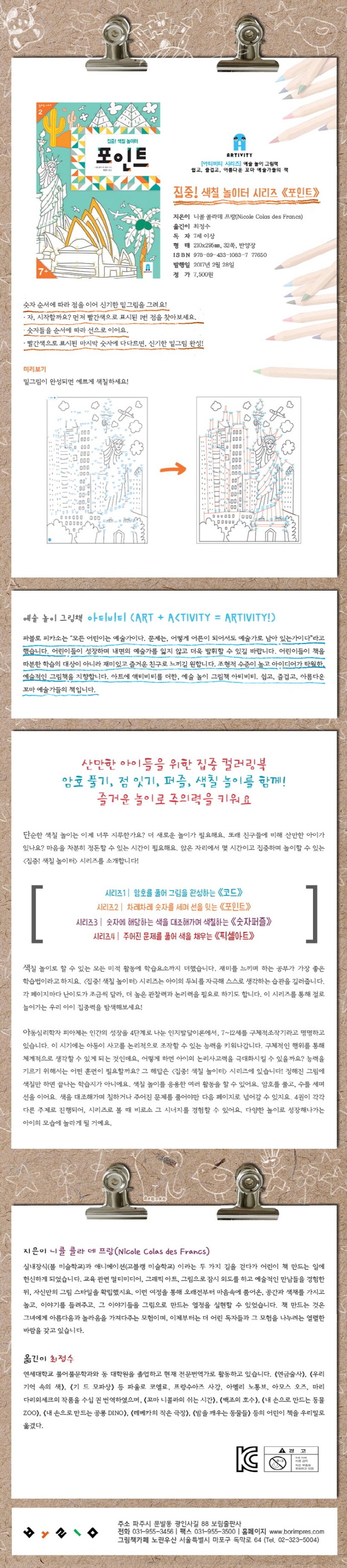 아티비티(Art+Activity) 시리즈는 아트에 액티비티를 더한, 예술 놀이 그림책 아티비티. 쉽고, 즐겁고, 아름다운 꼬마 예술가들의 책이다. 제2권 포인트에서는 숫자 순서에 따라 점을 이어 신기한 밑그림을 그리도록 구성했다. 먼저 빨간색으로 표시된 1번 점을 찾아보고, 숫자들을 순서에 따라 선으로 이어가다 보면 빨간색으로 표시된 마지막 숫자에 다다르게 된다. 신기한 밑그림이 어느새 완성되는 신기한 컬러링의 세계로 들어가보자!