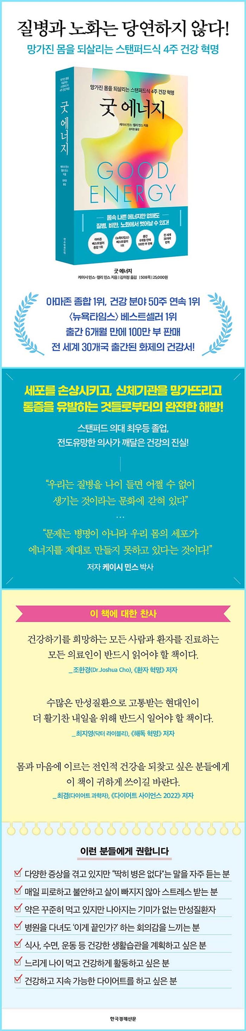 《굿 에너지(Good Energy)》는 이 단순하지만 불편한 질문에서 시작한다. 책의 저자이자 스탠퍼드 의대를 졸업한 외과의 케이시 민스 박사는 “문제는 병명이 아니라, 우리 몸의 세포가 에너지를 제대로 만들지 못하고 있다는 것”이라고 말한다. 저자는 환자들이 왜 같은 증상으로 다시 병원을 찾는지를 근본적으로 이해하고자 병원을 떠나, 세포 대사와 생체 에너지에 대한 연구에 매진했다. 그리고 수년의 임상과 실천을 바탕으로, “대부분의 만성질환은 세포 에너지 장애라는 한 가지 원인에서 비롯된다”는 강력한 결론에 도달한다.