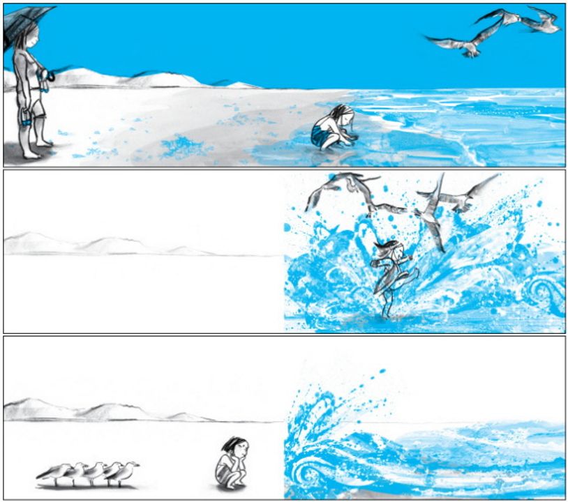 이 그림책은 어느 화창한 여름 날 엄마와 함께 한적한 바닷가에 놀러오게 된 소녀의 특별한 하루를 담아냈습니다. 파도와 소녀, 그리고 갈매기들을 만나보세요. 자유로운 먹선 위에다가 하얀색과 파란색만 사용한 생동감 넘치는 그림으로 글자 없이 이야기를 속도감 있게 끌어나간다는 것이 특징입니다.