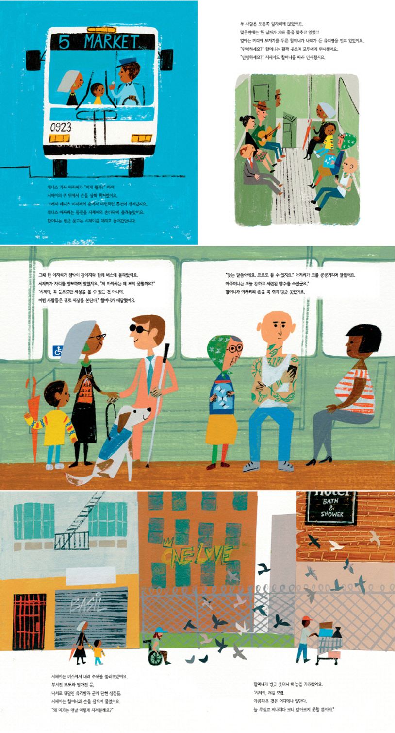 그림책 최초로 2016년 뉴베리 상과 칼데콧 명예상을 동시에 거머쥐며 주목을 받은 이 책은 평소에 느끼지 못했던 행복을 발견하게 만듭니다. 무료 급식소에 가지 않았다면 알 수 없었던 '이웃의 가난'처럼, 힘들고 어려운 사람들의 모습 역시 담아내 주위 이웃을 돌아보게 만들기도 합니다. 거기다 나이, 성별, 인종, 계급에 따른 다양한 이웃들이 타고 있는 버스 한 대는 매우 특별한 의미를 가지고 있습니다. '평등'이라는 가치를 내포하고 있기 때문인데요. 그림을 그린 크리스티안 로빈슨은 책 속에 아프리카계 미국인을 포함한 다양한 인종을 그려 내며 ‘코레타 스콧 킹 일러스트레이터 명예상’을 받기도 했습니다.