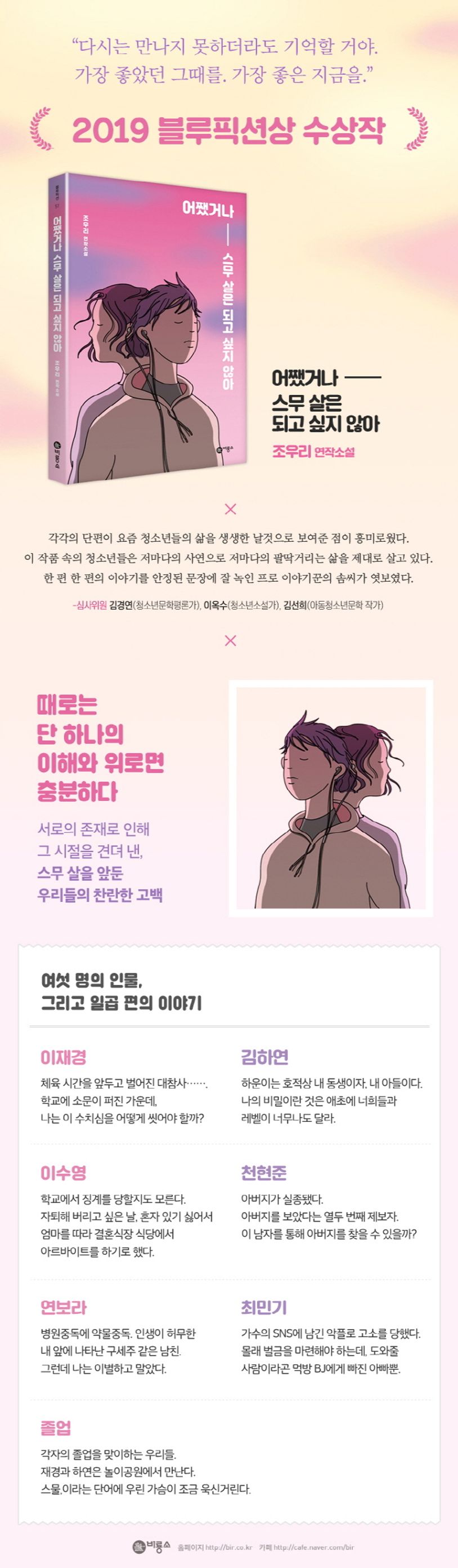마음을 붙잡는 새로운 이야깃거리로 십 대들과 가까이 호흡해 온 비룡소 블루픽션상의 제12회 수상작 『어쨌거나 스무 살은 되고 싶지 않아』. 고등학교 2학년 한 반의 아이 여섯 명이 등장하여 일곱 편의 이야기를 이끌어가는 연작소설로, 일생일대의 고민과 깊숙한 비밀을 제각기 품은 아이들의 이야기가 독립적이면서도 유기적으로 연결되어 있다.