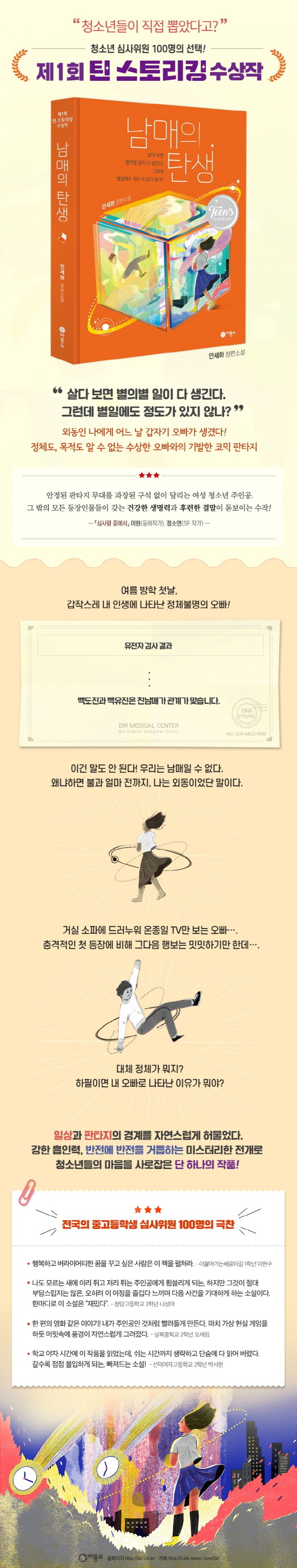 전국적으로 중학교 1학년부터 고등학교 3학년까지 다양한 십 대 연령층이 응모하여 선발된 청소년 심사위원단은 최종 본심에 오른 소설을 읽고 심사하여, 마음에 드는 단 하나의 작품을 뽑았다. 청소년이 직접 골라 읽을 스토리텔링의 힘이 강한 작품을 기대했던 틴 스토리킹의 취지에 맞게, 오로지 스토리텔링의 힘으로 청소년의 마음을 사로잡은 소설 『남매의 탄생』은 어느 날 갑자기 나타난 수상한 오빠의 정체를 밝히고자 십 대 주인공이 거침없이 달려 나가는 이야기를 그려 냈다. 일상 속에 판타지와 미스터리를 자연스럽게 녹여 낸 흥미진진한 전개로 청소년 심사위원단의 극찬을 받았다. 반전에 반전을 거듭하며 예측할 수 없는 이야기성과 강한 흡인력이 돋보인다. ‘살다 보면 별의별 일이 다 생기’는 우리네 인생이지만 매일 같은 하루하루가 반복되는 듯 보이기도 한다. 무료한 일상으로부터 신선한 탈출을 꿈꾸는 모든 십 대들의 손에 즐겁게 쥐어질 작품이다.