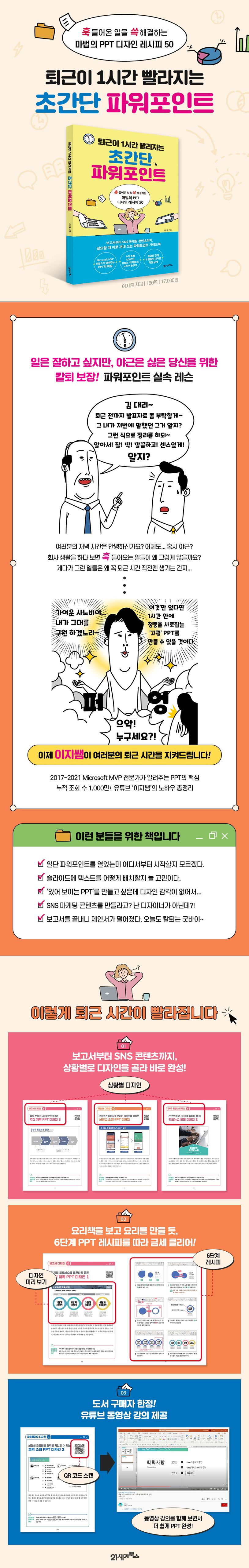 1분 1초가 아쉬운 직장인에게는 따로 실무를 배울 틈이 없다. 기본기를 다질 여유가 없다면, 역으로 실전에 부딪히면서 배워 보면 어떨까? 《퇴근이 1시간 빨라지는 초간단 파워포인트》는 보고서부터 제안서, 포트폴리오, SNS 마케팅 콘텐츠까지 실제 직장 생활에서 가장 많이 사용하는 파워포인트 디자인을 상황별로 정리한 ‘디자인 레시피북’이다. 요리의 기본기를 몰라도 레시피북을 따라 하다 보면 어느새 제법 그럴듯한 요리가 완성되듯이, 파워포인트의 수많은 기능과 옵션을 전부 마스터하지 않아도 괜찮다. 마치 요리책처럼, 하나의 슬라이드 디자인이 완성되는 과정을 각각 6단계 레시피로 정리하여 초보자도 쉽게 따라 만들며 파워포인트에 익숙해질 수 있도록 했다. 유튜브 13만 명의 구독자를 보유한 채널 〈이지쌤〉 운영, 2017~2021 Microsoft MVP 선정, 기업·학교·공공기관 등에서 강의하며 파워포인트 전문가로 활동해 온 ‘이지쌤’과 함께 오늘은 야근 말고 정시 퇴근에 도전해 보자.