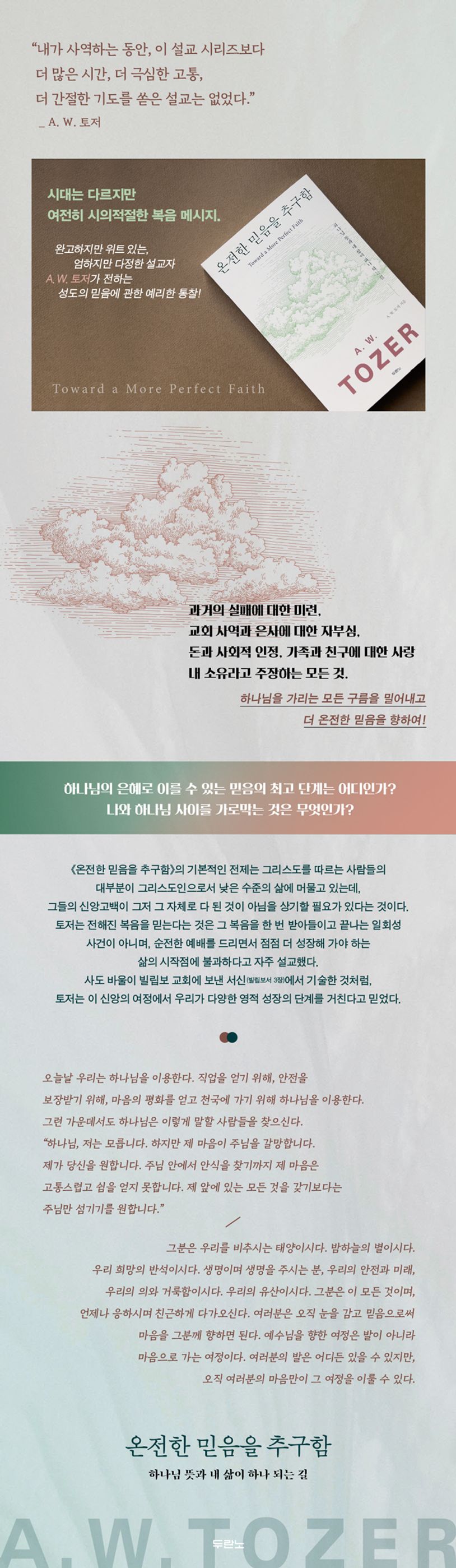 교회 생활에 드는 시간과 돈이 얼마인지 계산하는가? 성도의 삶이 편한지, 재미가 있는지, 인기가 있는지를 묻고 있는가? 그렇다면, 신앙 연수와 상관없이 아직 어린 성도일 뿐이다. 우리는 고통스럽더라도 하나님 뜻에 내 삶을 맞추고, 하나님만으로 만족하는 믿음의 단계에 올라서야 한다. 바울이 달려간 믿음의 경주, 초기 교회 영적 위인들의 삶, 빌립보서와 여러 경건서를 인용하며, 토저는 우리에게 미지근한 신앙에서 벗어나 비범하고 탁월한 영성을 갖추는 길로 나아가라고 외친다.
