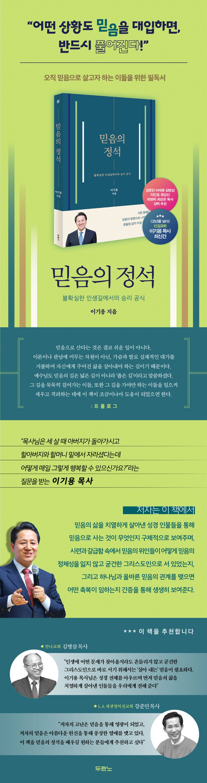 코로나19 팬데믹 이후 불확실성이 가속화되고 있는 이때, 많은 그리스도인이 방황하며 현재에만 매몰된 채 살아가고 있다. 변화무쌍한 일상 속에서 너끈하게 승리하기 위해서는 하나님이 주시는 ‘진짜’ 믿음이 필요하다. 세 살 때 아버지를 잃은 아픈 과거가 있지만 믿음의 심장으로 많은 영혼을 깨우고, 삶으로 믿음을 증명하고 있는 이기용 목사가 이 책에 믿음의 ‘정석’을 담았다.