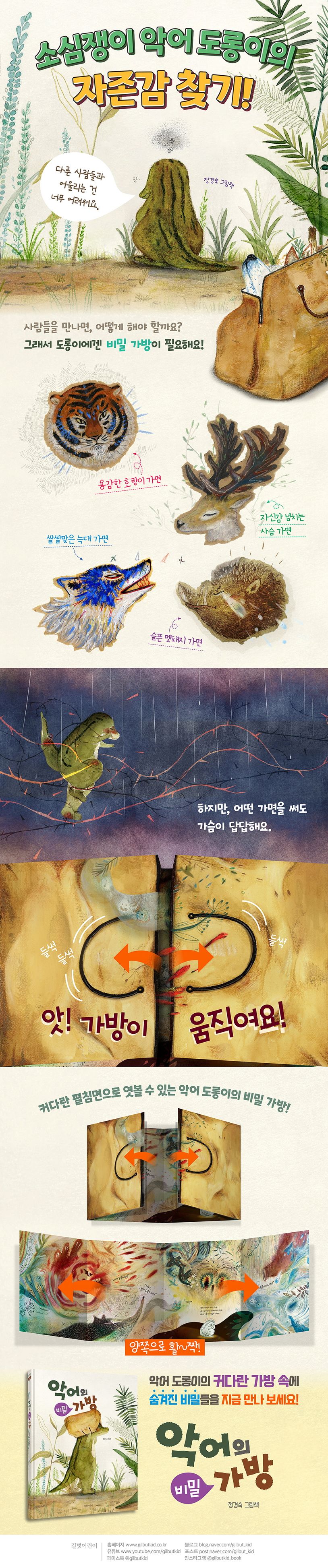 《악어의 비밀 가방》은 소심한 악어 도롱이가 다른 사람과 함께 있을 때마다 비밀 가방 속 가면을 꺼내 쓰면서 벌어지는 이야기를 담았습니다. 처음 만나는 사람들에게는 무슨 말을 해야 할지, 혼자 있고 싶은데 다가오는 사람들에게는 어떻게 거절해야 할지, 버럭 화부터 내는 사람들에게는 어떻게 대처해야 하는지 등 사람들과 어울리는 것이 너무 어려운 도롱이는 가면을 쓰면서 자신의 진짜 모습은 감추고, 남들에게 보여 주고 싶은 모습을 내세웁니다. 낯을 많이 가리고 소심한 모든 사람들처럼 말이지요. 정경숙 작가는 수채 물감과 색연필, 오일 파스텔을 사용해 악어 도롱이의 다양한 감정들을 그려 냄과 동시에, 콜라주 기법으로 그림을 더욱 생동감 있게 표현해 냈습니다. 또한 악어가 들고 다니는 비밀 가방을 양쪽으로 펼쳐지는 펼침 페이지로 만들어 독자들에게 뜻밖의 즐거움을 선사합니다. 이제 《악어의 비밀 가방》 속 겁 많은 도롱이와 함께, 낮아졌던 자존감을 다시 끌어올리는 연습을 시작해 보세요!