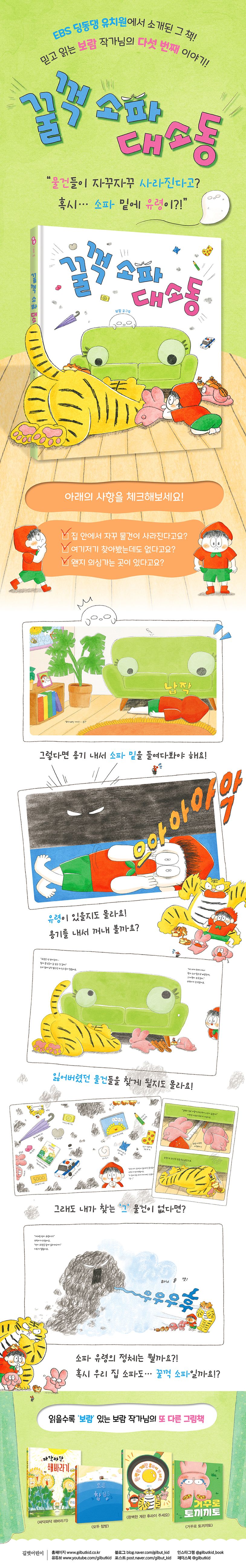 《꿀꺽 소파 대소동》은 소파 밑의 유령과 눈을 마주쳐 버린 수박이와 친구들이 숨어 있는 유령의 정체를 파헤치는 오싹오싹, 호기심 가득한 그림책이에요. 유령을 찾기 위해 소파 밑을 뒤지던 친구들은 잃어버렸던 물건들을 하나씩 발견하고, 수박이는 그 물건과 함께했던 소중한 기억도 떠올리게 되지요. 그리고 마침내, 무시무시한 유령과 만나기도 합니다! 늘 기발하면서 다정한 이야기로 독자들의 마음을 사로잡았던 보람 작가는 이번 그림책에서 ‘처음엔 무서웠지만, 함께여서 용기를 낼 수 있었던’ 수박이의 경험을 유쾌하게 풀어냈습니다. 거기에 아무도 몰랐던 기막힌 반전까지 이야기에 숨겨져 있답니다! 《꿀꺽 소파 대소동》에서 소파 밑 유령의 정체를 함께 확인해 보세요!