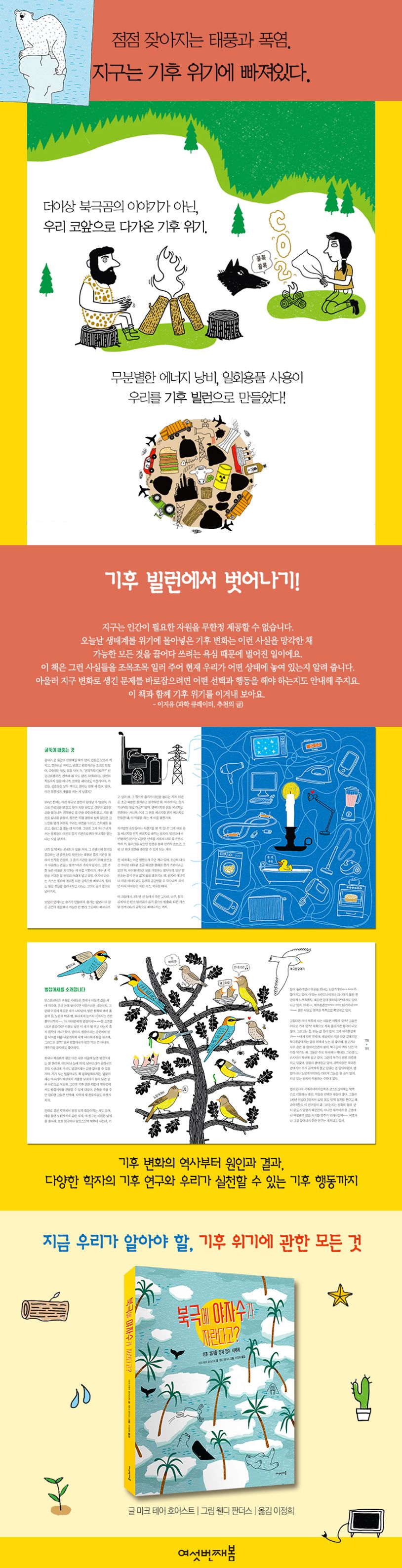 북극에 야자수가 자라던 시절이 있다. 지금은 눈과 얼음밖에 없는 그곳에 열대 식물이 살았다는 얘기다. 미래에 우리는 또다시 북극에서 야자수를 보게 될지도 모른다. 기후는 끊임없이 변화하기 때문이다. 빙하 시대에는 지구가 지금보다 훨씬 추웠고, 공룡 시대에는 지금보다 더 따뜻했던 것처럼 말이다. 그런데 최근에는 기후가 너무 빠르게 변화하고 있다. 기후는 물리학, 화학, 지질학, 생물학, 기상학과 같은 여러 학문이 복잡하게 얽혀 있는 어려운 문제여서 우리가 전부 이해하기는 어렵다. 거리에서 기후 위기 캠페인을 벌이고, 방송에서도 기후 위기에 대처해야 한다고 말하는 사람이 많아졌지만, 우리는 기후 위기에 대해 제대로 알고 있지 못하다. 북극곰에게 지금 무슨 일이 일어나고 있는지, 왜 폭염과 산불, 폭우와 태풍, 생태계와 식량 변화에 관한 뉴스가 많아졌는지. 저자는 여러 학자의 연구를 살펴보고 우리가 쉽게 기후 변화를 이해할 수 있게 한 권의 책으로 정리했다. 좀 더 많은 사람이 이 변화를 알아차릴 수 있도록, 관심을 갖도록.