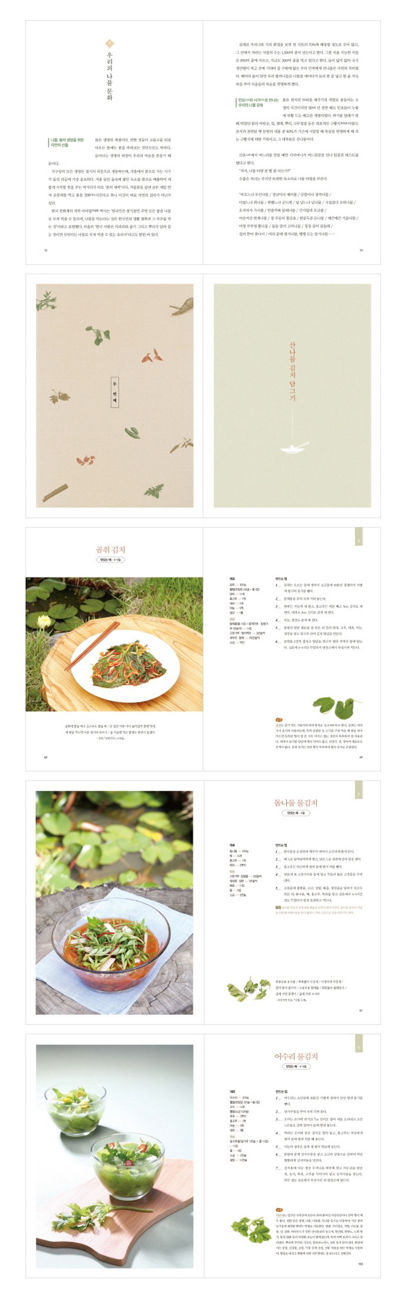 국제식품규격위원회(Codex)에서는 ‘김치’를 ‘주원료인 배추를 절임하여 여러 가지 양념류를 혼합하여 젖산 생성에 의한 적절한 숙성과 보존성이 확보되도록 저온에서 발효된 제품’이라고 정의하고 있다. 우리가 먹는 산나물 또한 겉절이를 비롯한 김치로 만들 수 있으며, 주로 사찰에서 소금에 절이지 않고 끓는 물에 데쳐 즉시 먹을 수 있도록 배려한 익선김치까지 포함하면 나물로 담글 수 있는 김치의 범위는 훨씬 더 넓어진다. 묵은 김치, 익숙한 김치도 좋지만 자연의 기운이 살아 있는 푸성귀로 김치를 담가 계절의 신선함과 풍요로움을 느껴보는 것은 어떨까.