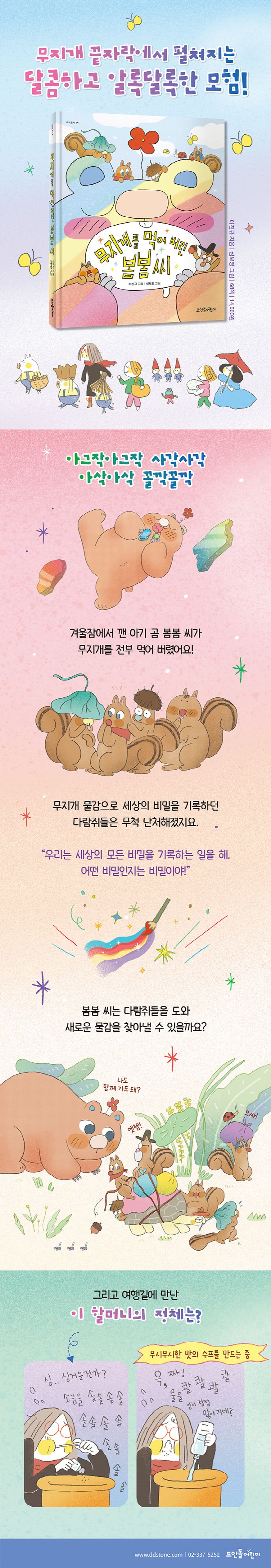 무지개 끝자락에서 펼쳐지는 달콤하고 알록달록한 모험! 숲속을 발칵 뒤집어 놓은 아기 곰 봄봄 씨와 다람쥐들의 이야기예요. 나란히 걷던 길에 마주친 다양한 캐릭터들과 깜찍하고 사랑스러운 그림이 어린이 독자들의 상상력을 자극해요. 큰 솥에 무언가를 끓이던 할머니의 정체가 밝혀지는 순간, 더 넓은 책 속 세상이 펼쳐질 거예요.