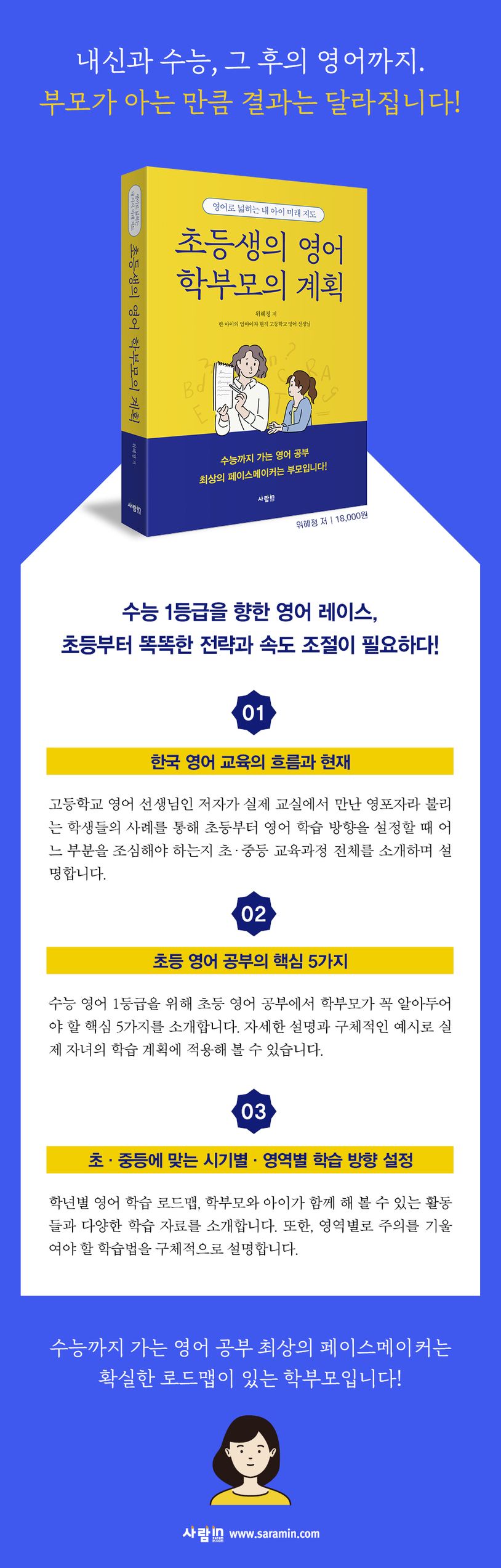고등학교 영어 교사이자 한 아이의 부모인 저자는 교사로서의 경험을 토대로 학부모가 아이들의 영어 실력 향상을 위해 초등부터 무엇을 준비하고 계획해야 하는지 알려 줍니다. 부모가 한국 영어 교육의 전반적 상황을 이해하며 자녀의 학습 속도에 맞춰 초등부터 전략적인 영어 공부의 방향을 설정할 수 있도록 초·중등 영어 공부 로드맵과 함께 핵심 학습법을 소개합니다.