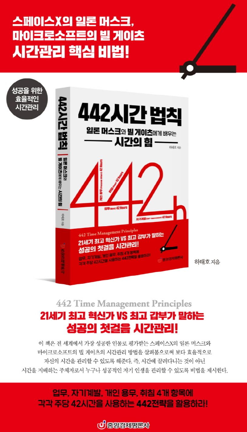 또한 시간관리 전문가인 저자가 성공하는 사람이 되기 위한 가장 효과적인 방법으로 ‘442전략’을 제시한다. 이른바 주 단위로 4개 항목(업무, 자기계발, 개인 용무, 취침)에서 각각 42시간씩 사용하는 것이다. 하루 단위로 구분하면 6시간을 쓰는 것을 목표로 하면 된다. 이러한 시간관리는 자기관리이자 인생관리가 되고, 내 인생 최고의 무기가 될 것이다.