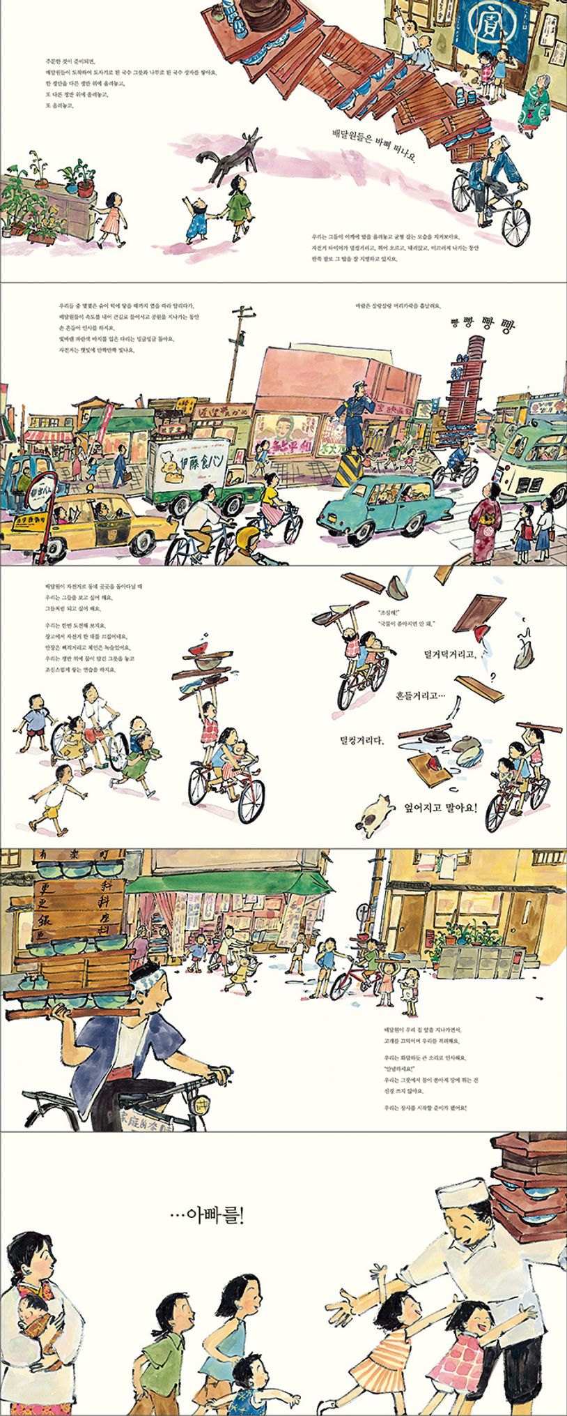 우리에게도 추억 속에 간직되는 배달 문화가 있다. 머리에 쟁반을 여러 층 얹고 백반을 배달하던 아주머니들의 모습과, 가게에서 사용하는 그릇 그대로 철가방에 담아 쏜살같이 달려오던 중국집의 짜장면 배달이 바로 그것이다. 따끈따끈한 밥과 면을 바닥까지 남김없이 비우고, 그릇을 집 밖에 내놓으면 어느새 배달원이 그릇을 수거해 가곤 했다. 『자전거를 탄 국수』에 등장하는 가족이 소바 그릇을 깨끗이 닦아 뜨락에 내놓은 것처럼 우리도 가게의 수고를 덜어 주고자 그릇을 설거지 하여 내놓기도 했다. 가게에 직접 전화를 걸어 주문을 하고, 문을 열고 인사하며 음식을 주고받던 이러한 배달 문화는 어플리케이션을 통한 주문, 비대면 배달, 일회용 배달 용기의 등장으로 이제는 보기 힘든 모습이 되었다. 『자전거를 탄 국수』는 그런 옛날의 추억을 되새기며 생계를 유지하기 위해 치열하게 살았던 배달원의 하루를 예술적으로 재현하고 있다.
