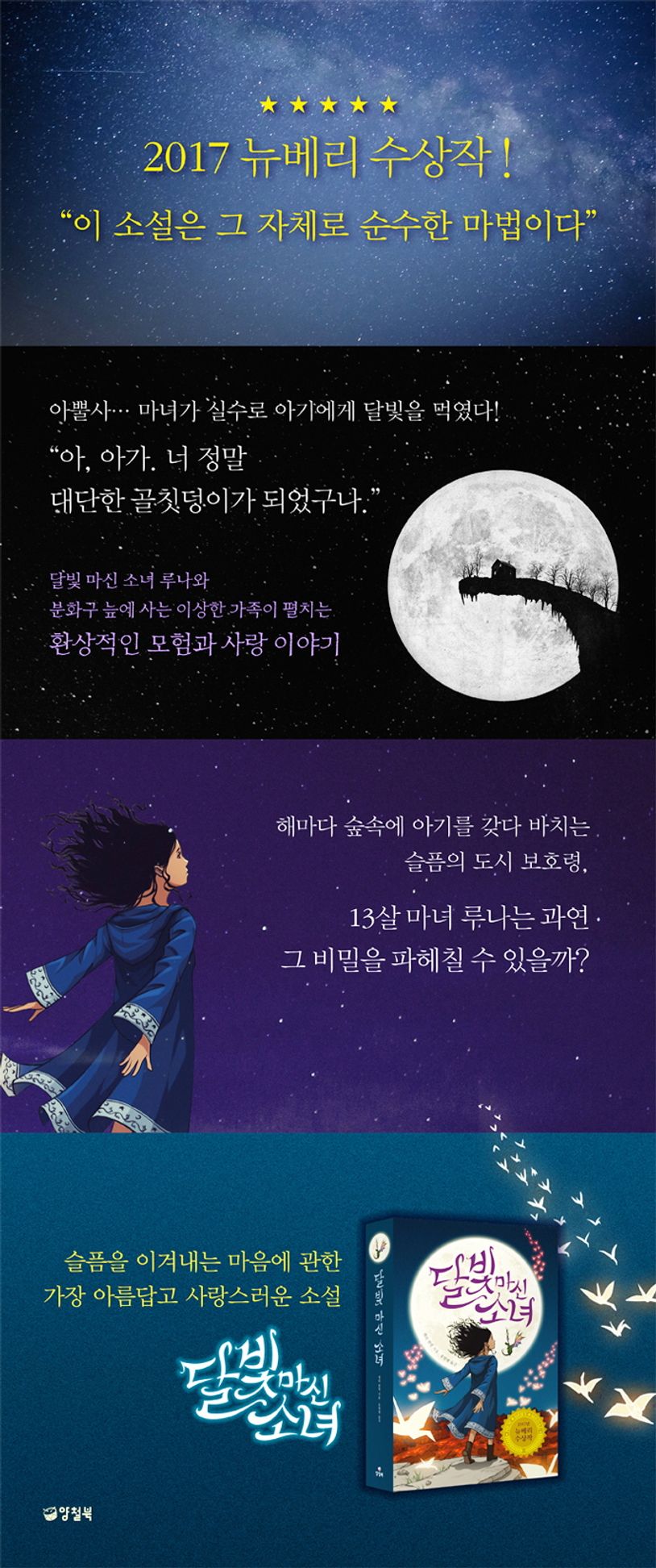최고의어린이책에수여하는뉴베리2017년도수상작은출간되자마자온갖매체의극찬이이어진켈리반힐의《달빛마신소녀》에게돌아갔다.