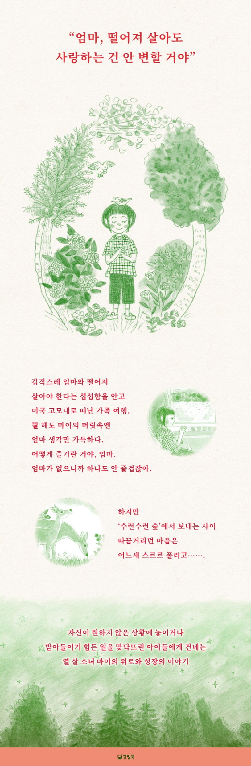 이 책은 아이들이 자라며 겪게 되는 마음의 부침 속에서, 마음이 한 뼘 자라는 성장의 과정을 잘 보여 주는 동화다. 갑작스레 엄마와 떨어져 살아야 하는 열 살 여자아이가 느끼는 감정을 섬세하게 담아냈다. 엄마를 이해하려는 마음과 자신이 느끼는 마음속 불안의 모순된 마음을 조율하기 위해 얼마나 애쓰고 있는지를, 그 마음을 자기 안에서 어떻게 소화하며 단단해지는지를 보여 준다. 특히나 한부모 가정이 많아지는 상황에서 자신이 원하지 않은 상황에 놓여 있는 아이들이 ‘수런수런 숲’에서 위로받고 마음의 힘을 키울 수 있기를 바란다.