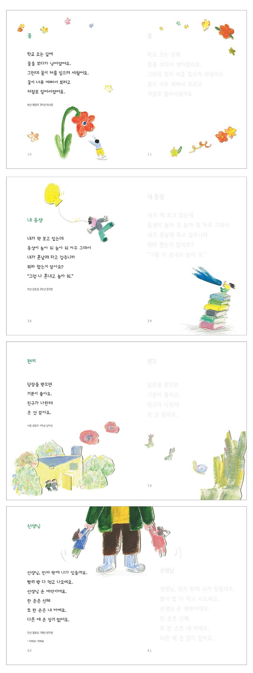 “맞아, 맞아. 나도 그래.”하며 따라 쓰다 보면 연필 쥔 손에 힘이 생기고, “나도 쓸래” 자기 목소리를 낼 것이다. 장마다 아이들이 시 쓰고 그림 그릴 수 있는 자리도 마련해 놓았다. 아이들이 책장을 반듯이 펴서 편하게 읽고 쓸 수 있도록 책등 없는 양장본으로 만들었다. 이 책이 가진 또 하나의 친절함이다.