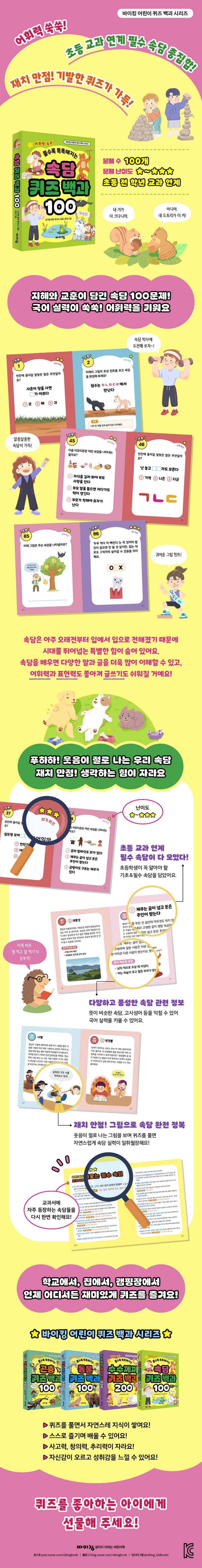 한손에쏙!책이작고가벼워언제어디서든편하게들고다닐수있어요.친구랑놀때,자기전에,놀러가는차안에서풀어보세요.혼자풀어도재미있고친구랑풀면더재밌어요!가족,친구랑서로문제를내며누가더많이맞히나내기를해도좋아요.한번펼치면끝까지풀고싶어질거예요.100문제를다풀어본다음,몇문제를맞혔는지개수를세어보세요.적게맞혔어도괜찮아요!중요한건정답을맞히기위해떠올렸던생각들이에요.그림을보고유추하거나상상하는동안창의력이쑥쑥자라기때문이지요.가장기억에남는속담은무엇인가요?속담의뜻을알고적절하게활용하다보면어휘력이쑥쑥자랄거예요!그럼안녕!다음에또만나요!