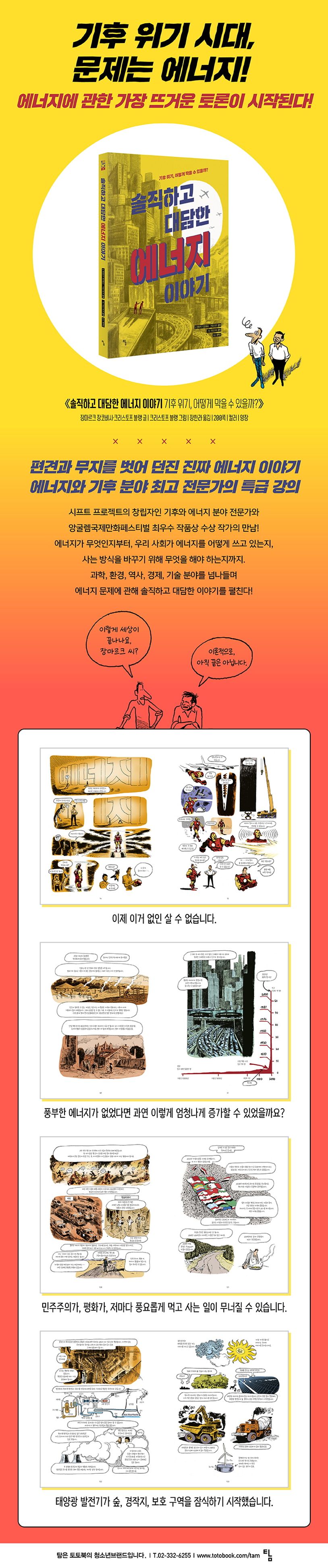 2023년 내내 프랑스 아마존을 뜨겁게 달군 그래픽노블 《솔직하고 대담한 에너지 이야기》는 시프트 프로젝트의 창립자인 기후와 에너지 분야 전문가와 앙굴렘국제만화페스티벌 최우수 작품상 수상 작가의 만남으로 탄생했습니다. 장마크르와 크리스토프는 에너지가 무엇인지부터, 우리 사회가 에너지를 어떻게 쓰고 있는지, 사는 방식을 바꾸기 위해 무엇을 해야 하는지까지 자세하게 짚어 줍니다. 과학, 환경, 역사, 경제, 기술 분야를 넘나들며 에너지과 기후에 관해 뜨겁게 토론하는 현장으로 초대합니다.
