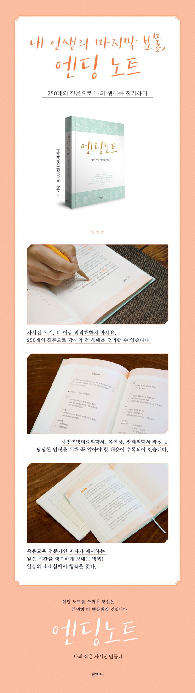 ▶당당한안녕:더아름답고존엄한죽음을위한죽음공부.『엔딩노트』는지나온과거의삶만돌아보지않는다.더나은현재를살게하며나아가더당당하고,존엄한죽음을맞이하도록돕는다.고령화사회에들어서면서‘죽음’은사회적으로도중요한이슈가되었다.죽음은삶의아름다운마지막숙제다.그러나많은사람이그숙제를갑작스럽게,아무준비없이맞는다.저자는누구든지미리죽음에관한공부를하고,인생의마지막숙제를아름답게마무리해야한다고말한다.저자의전작『당당한안녕』에서삶의가장마지막과제인‘잘죽는것’을이야기한바있다.이책은『당당한안녕』에서말하는‘웰다잉(잘죽는것)’의실천편이라할수있다.『엔딩노트』에는고령자의료지원센터,사전연명의료의향서,유언장작성,장례의향서등의작성방법과그의미를소개한다.이러한죽음준비는보다내가원하는모습의죽음을맞이할수있게도와준다.▶40년간가족,여성,노인,그리고죽음을연구한저자의‘웰다잉’을위한고민과실제적조언.이기숙저자는가족,여성,그리고노인에대해40년간연구해온전문가이다.대학에서‘중노년기가족’과‘노년학’을주로연구하고가르쳤으며,꾸준히죽음교육을공부하여‘미국죽음교육및상담학회(ADEC)’의국제죽음전문가자격을취득했다.부산에‘한국다잉매터스’를개소하여죽음교육과애도상담을주요주제로다양한사업을수행하고있다.전작『당당한안녕:죽음을배우다』를통해‘가족학적관점’에서죽음을바라보고,죽음을대하는우리의태도를성찰할수있는글을담아낸바있다.『엔딩노트』는실제로자신의말과표현으로당당한안녕을실천하는워크북이다.사람은누구나죽는다.하지만언제죽을지는모른다.좋은‘엔딩’을맞이하기위해서는과거의나,그리고지금의나를돌아보고미래의내모습을준비해야한다.잘살았고(Well-being),잘늙었으니(Well-aging),잘죽는것(Well-dying)이남아있는것이다.▶인생의마지막순간까지간직할보물,나의작은자서전‘엔딩노트’.『엔딩노트』는총4부로구성되어있다.1부‘이렇게살아왔군요!’에서는나의탄생부터현재에이르기까지전생애를생애주기에따라훑어본다.그리고생애주기마다스스로매기는행복점수로‘나의인생곡선’을그려본다.2부‘지금,나를점검하다’에서는현재자신의삶을돌아본다.현재나의삶에서무엇이문제인지,무엇을수정해야하는지를찾아본다.일상생활,취미/여가활동,건강상태등을점검함으로써더건강하고행복한삶을지내도록돕는다.특별히사회관계망그림을통해우리인생에등장하는많은사람과의관계를점검해본다.3부‘남은시간이얼마나될까?뭘준비하지?’는본격적으로당당한죽음을준비하는단계다.평균기대수명을토대로자신에게남아있는,죽음을준비할시간을계산해본다.신체적도움이필요할때찾아갈수있는고령자의료지원센터를소개하고,임종기에닥칠치료에대한자신의의사를표현하는사전연명의료의향서작성,유언장작성,장례의향서작성방법등을소개한다.4부‘남은시간,행복하게보내기’는자신의버킷리스트를작성하듯,행복한여생을위해자신이정말로원하는것을찾아보는장이다.저자가제안하는행복연습은일기쓰기,매일조금씩산책하기,어린아이들과지내기,재래시장나가보기등소소한일상에서시작된다.250개의질문으로완성될‘엔딩노트’는당신이인생의마지막순간까지가지고갈‘작은자서전’이될것이다.