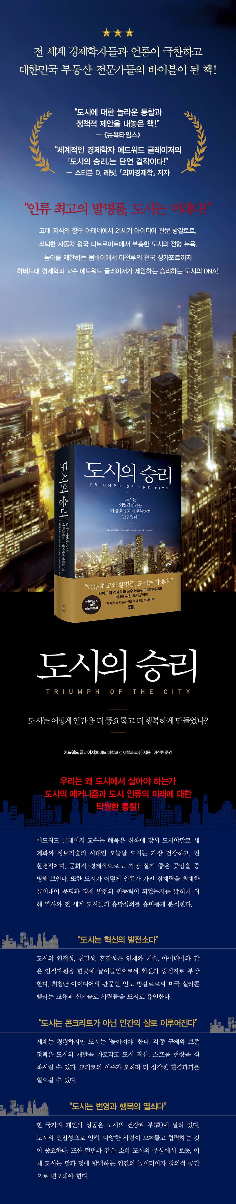 이 책은 2011년 2월 미국에서 출간 즉시 아마존,《뉴욕타임스》베스트셀러를 기록하며 “도시에 대한 놀라운 통찰과 정책적 제안을 내놓은 책”(《뉴욕타임스》) “경제학과 역사를 매끈하게 연결하며 도시가 ‘우리 인류의 가장 위대한 발명품’인 이유가 무엇인지를 설명한 걸작”(스티븐 D. 레빗,『괴짜경제학』저자)이라는 찬사를 받았다. 급격한 경제성장과 협소한 국토 면적 등으로 심각한 도시 문제를 안고 있는 우리의 실정에 비해 도시경제학에 대한 대중서가 전무하다시피 한 상황에서 그 출간의 의미가 남다르다고 할 수 있다.