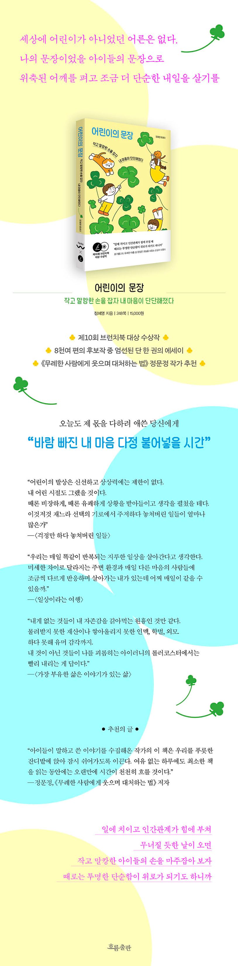 8천여 편의 후보작 중 엄선된 단 한 권의 에세이 《어린이의 문장》은 유쾌하고 말랑말랑한 아이들의 글과 따스한 시선을 가진 작가의 마음이 모여 커다란 힘을 발휘한다. 초등교사로 20여 년이 넘는 기간 아이들과 함께하고 있는 작가의 이 책을 읽노라면 아이들의 엉뚱하고 신박한 표현에 미소 짓고 어느새 가슴 한편엔 온기가 퍼지고 있는 자신을 발견할 것이다.