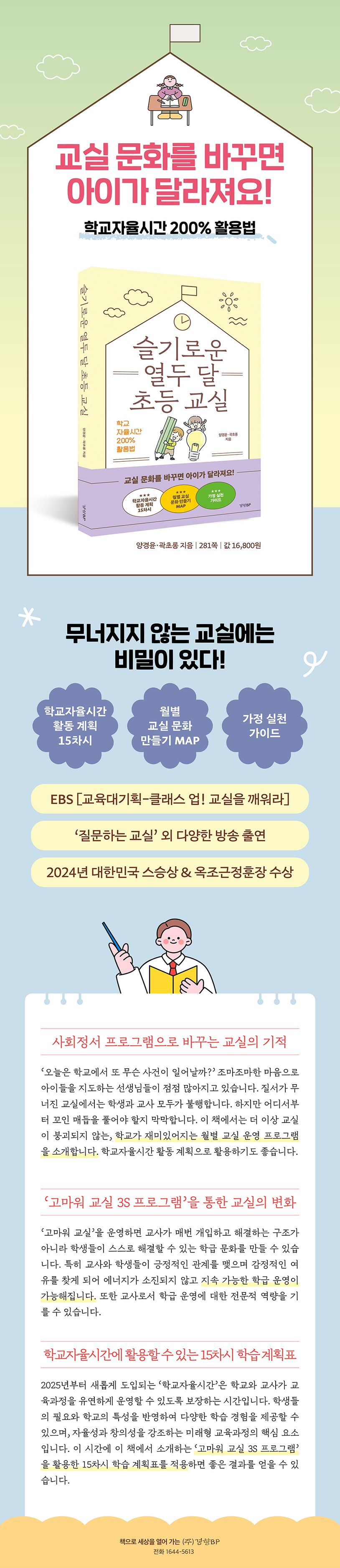‘오늘은 학교에서 또 무슨 사건이 일어날까?’ 조마조마한 마음으로 아이들을 지도하는 선생님들이 점점 많아지고 있습니다. 질서가 무너진 교실에서는 학생과 교사 모두가 불행합니다. 하지만 어디서부터 꼬인 매듭을 풀어야 할지 막막합니다. 이 책에서는 더 이상 교실이 붕괴되지 않는, 학교가 재미있어지는 월별 교실 운영 프로그램을 소개합니다. 학교자율시간 활동 계획으로 활용하기도 좋습니다.