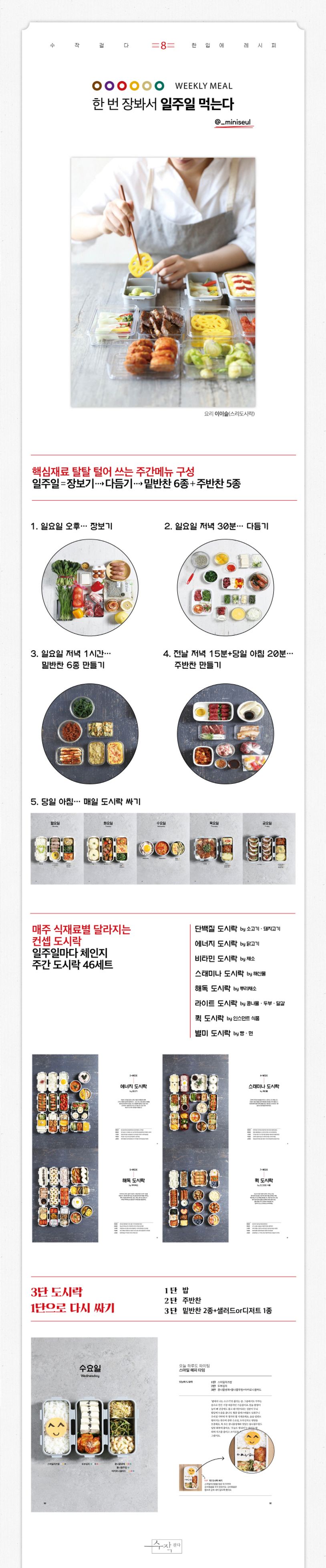 책에는 주간 컨셉별로 장보기부터 주 5일 도시락 구성하는 요령까지 모두 담겨 있다. 특히 장보기 파트에서는 주반찬의 기본 재료인 핵심 재료, 밑반찬에 필요한 부재료, 그밖에 채소와 기타, 소스 정보까지 구체적인 리스트를 제시하였다. 이어 주반찬과 밑반찬으로 나눠 각각의 식재료 다듬는 요령까지 소개하였다.