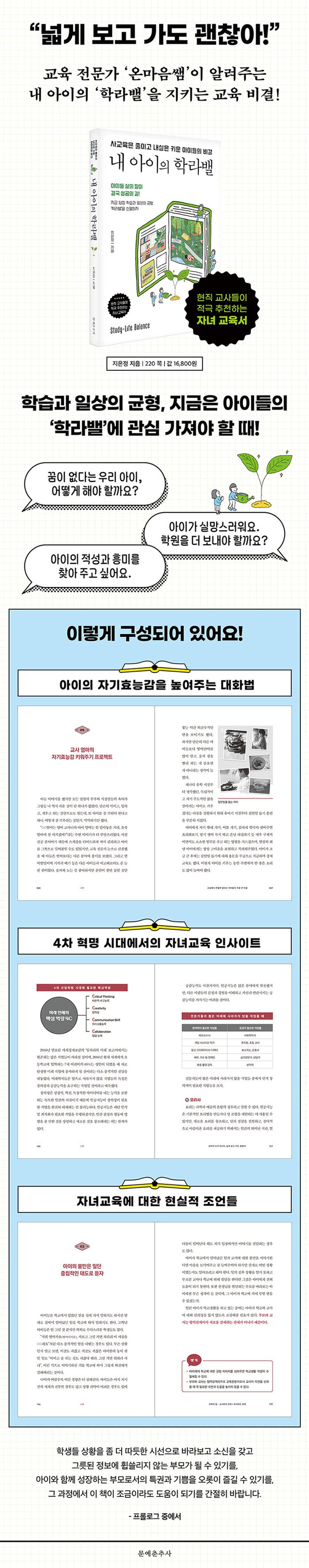점점 더 끝없는 경쟁으로 치닫고 진위를 알 수 없는 자극적인 교육정보가 홍수를 이루는 아이들 현실에서, 그 아이들이 겪는 심리적인 고통과 막막함에도 우리의 관심이 필요하다. 이젠 학생들 상황을 좀 더 따듯한 시선으로 바라보고 소신을 갖고 그릇된 정보에 휩쓸리지 않는 부모가 되는 길, 아이와 함께 성장하는 부모로서의 특권과 기쁨을 오롯이 즐길 수 있는 길을 함께 찾아보자. 《내 아이의 학라밸》은 그 길에 대한 매우 구체적이고 성의 가득한 도움을 줄 수 있을 것이다.