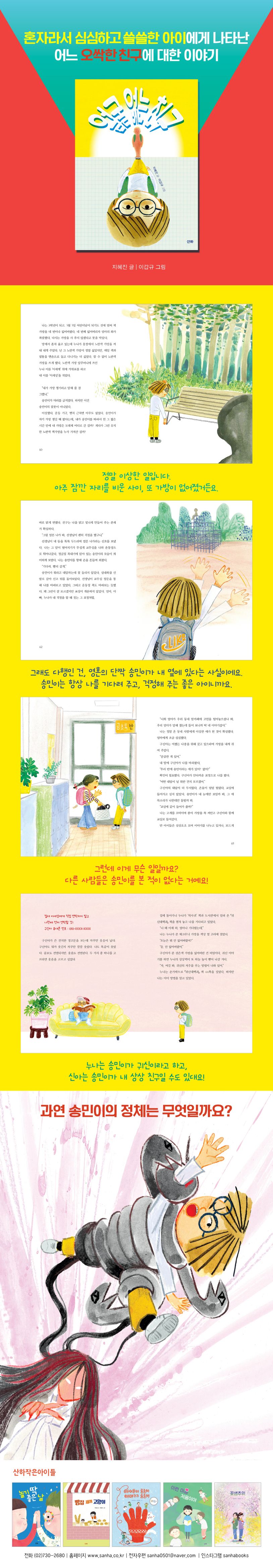 하지만 불행 중 다행인 건, 세상이에게는 무엇이든 함께하는 친구 송민이가 있다는 사실이었습니다. 물건을 잃어버려도 송민이가 웃으며 다가와 주면 모든 게 괜찮아지는 것 같았으니까요. 그러나 한편으로는 세상이의 마음 깊은 곳에서 어떤 질문이 들려왔습니다. 그 아이는 어쩜 그렇게 내가 필요할 때마다 귀신같이 알고 찾아오는지, 다른 사람들과 있을 땐 어쩜 그렇게 귀신같이 사라지는지, 왜 그 아이와 놀고 나면 꼭 없어지는 게 있는지. 세상이는 궁금해졌습니다.