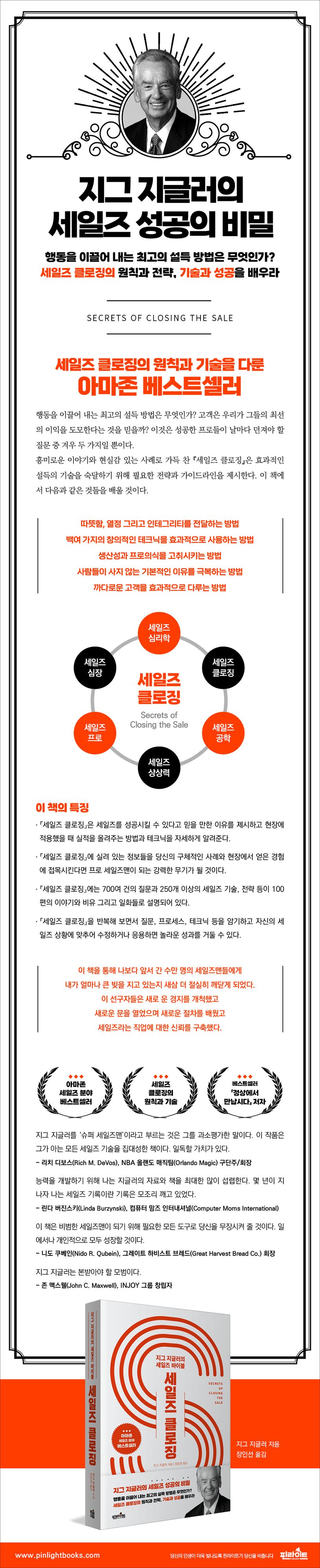 세일즈 관련 책으로는 드물게 세계적 베스트셀러가 된 지그 지글러의 『세일즈 클로징』은 오늘날에도 많은 이들에게 훌륭한 영감과 창조력을 제공하고 있으며, 지금까지 발행된 세일즈 관련 도서의 결정판이라 일컬어진다. 지그 지글러는 평생 동안 물건을 팔고 서비스를 제공하는 세일즈맨이었다. 그는 세일즈맨이라는 명함을 가진 사람이 경험할 수 있는 모든 상황들을 직접 경험한 후에 세일즈 성공의 원리와 기술, 노하우를 『세일즈 클로징』에 전부 담았다.