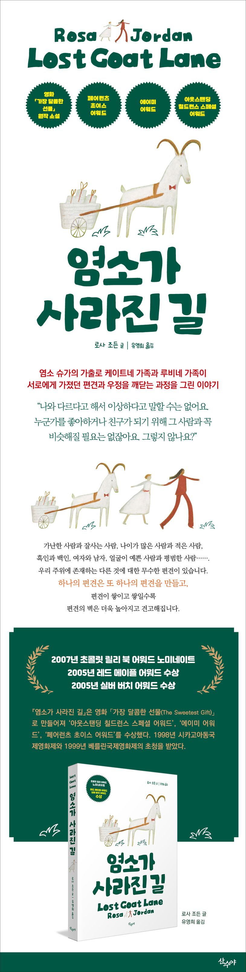 어느 날 우리에서 사라진 염소 슈가, 케이트는 자신이 돌보던 슈가를 찾는 과정에서 전혀 왕래가 없었던 이웃인 루비네 가족을 알게 되면서 서로에게 가졌던 편견과 우정과 자신을 사랑하는 법을 깨닫는 과정을 로사 조던 특유의 감성으로 풀어냈다.