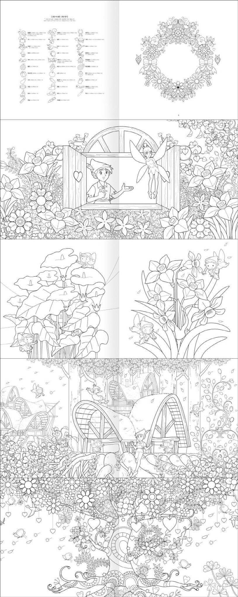 특별한 컬러링북 『네버엔딩스토리(Neverending Story)』. 어린시절의 추억 같은 피터팬의 이야기, 동심을 일으키는 어른들의 동화 네버엔딩스토리 속에는 화려하면서도 아름다운 풍경이 가득한 컬러링북은 개인의 취향에 따라 골라 색칠하면쁜 그림을 보면 저절로 색칠하고픈 마음이 우러나온다. 한 장 한 장 완성해 보면 뿌듯한 결과물에 감동하게 된다.