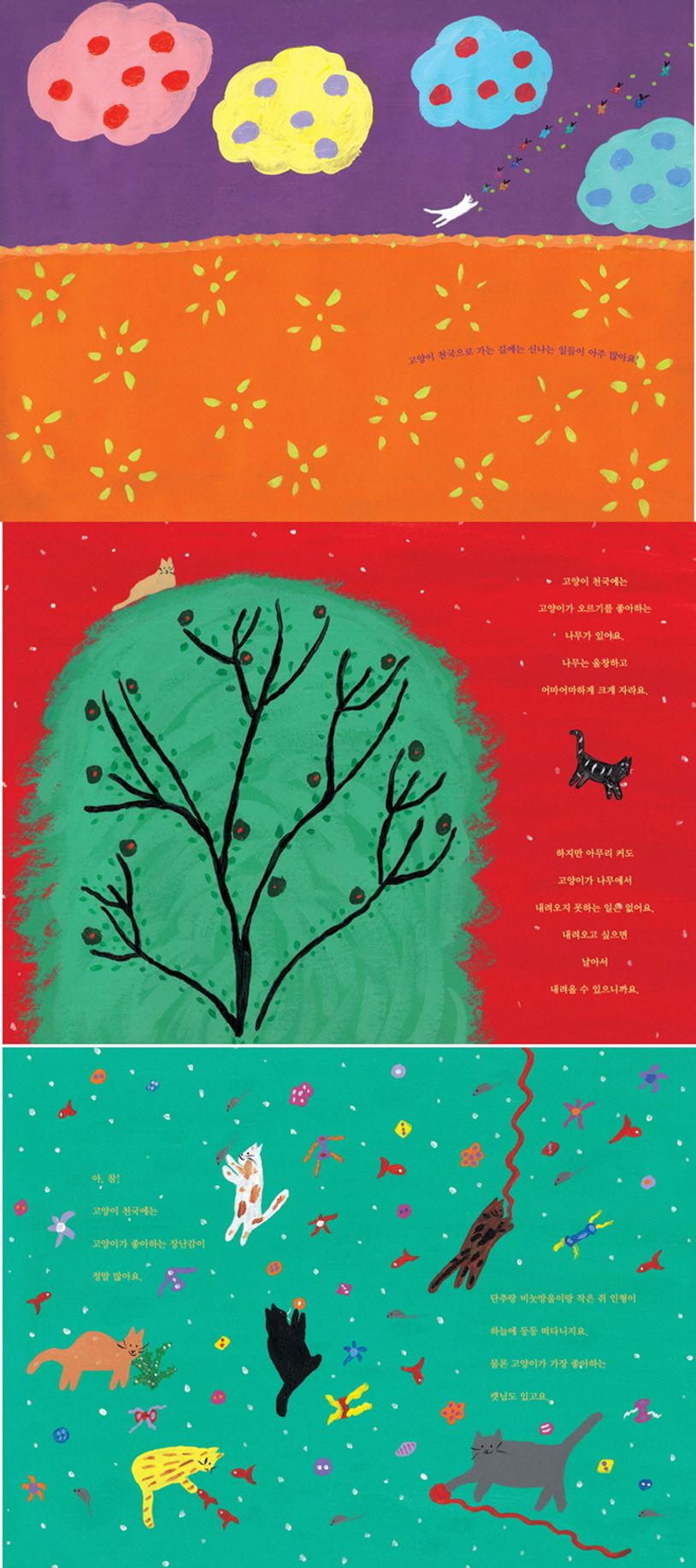 그런사람들의믿음을반려인인작가가구체적으로그려냈다.호기심많은고양이가눈을반짝이며실컷뛰놀수있는나비와귀뚜라미가가득한들판,한참을놀다들어와도먹을수있는우유와고양이를위한만찬이준비되어있는곳,고개만들면고양이가좋아하는쥐모양장난감,캣닙등각종장난감이떠다니는곳.그곳이바로고양이천국이다.