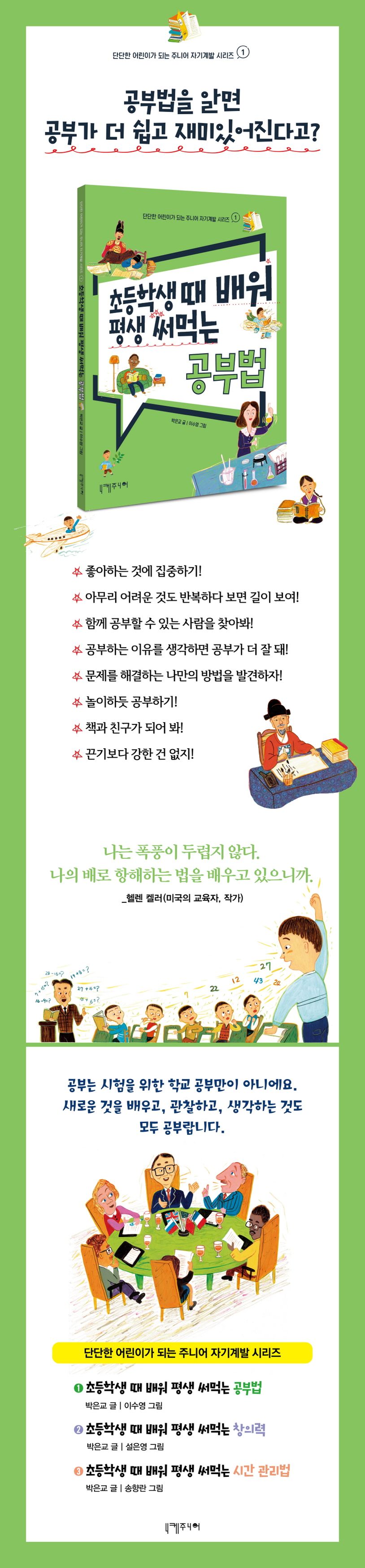 ‘단단한 어린이가 되는 주니어 자기계발 시리즈’는 초등학생을 위한 본격 자기계발 도서입니다. 마냥 어린아이라고 생각해서 생활 전반을 부모가 컨트롤하게 되면 아이들이 스스로 생각을 결정하고, 계획하고, 판단하는 능력이 키우기 어렵습니다. 〈공부법〉 〈창의력〉 〈시간 관리법〉 등 총 3권으로 구성된 이 시리즈는 초등학생들이 어릴 때부터 시작할 수 있는 자기관리에 꼭 필요한 내용을, 인물의 이야기와 함께 들려줌으로써 자연스럽게 따라 할 수 있도록 구성한 책입니다.