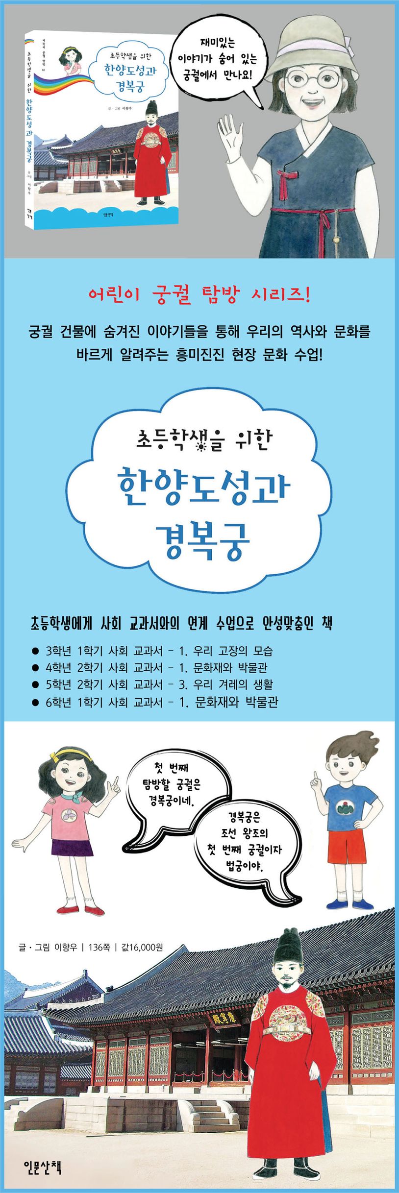 궁궐 건물에 숨겨진 이야기들을 통해 우리의 역사와 문화를 바르게 알려주는 흥미진진 현장 문화 수업에 적합한 책으로, 선생님 또는 부모님이 아이들과 함께 궁궐을 탐방하면서 지도하기에 적합하게 구성되어 있다. 또한 초등학생에게는 사회 교과서와의 연계 수업으로도 안성맞춤이다.
